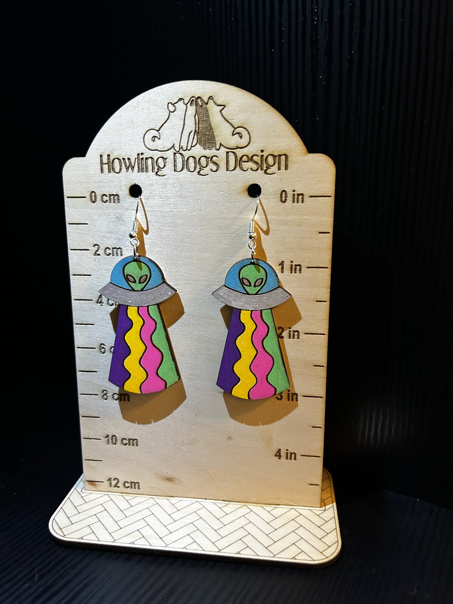 Experience out-of-this-world style with our Alien Abduction earrings. These laser cut wood earrings are hand painted for a unique and eye-catching look. Don't miss your chance to beam up your accessory game.