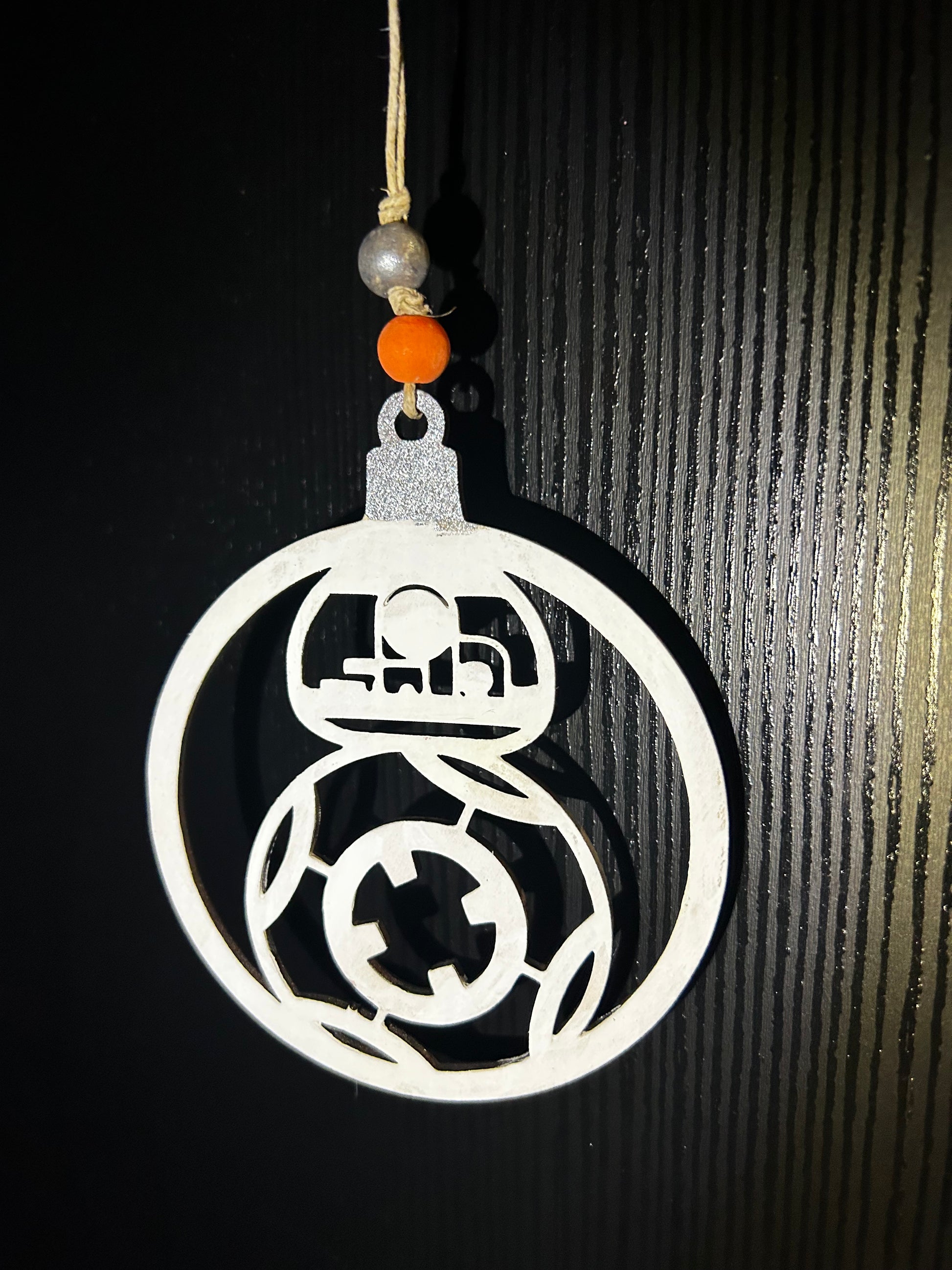 Expertly crafted with laser-cut wood and hand-painted details, the BB8 ornament is a must-have addition to your holiday decor. Its intricate design captures the essence of this beloved Star Wars character, adding a touch of sci-fi magic to your tree. Bring BB8 home and feel the force this holiday season.
