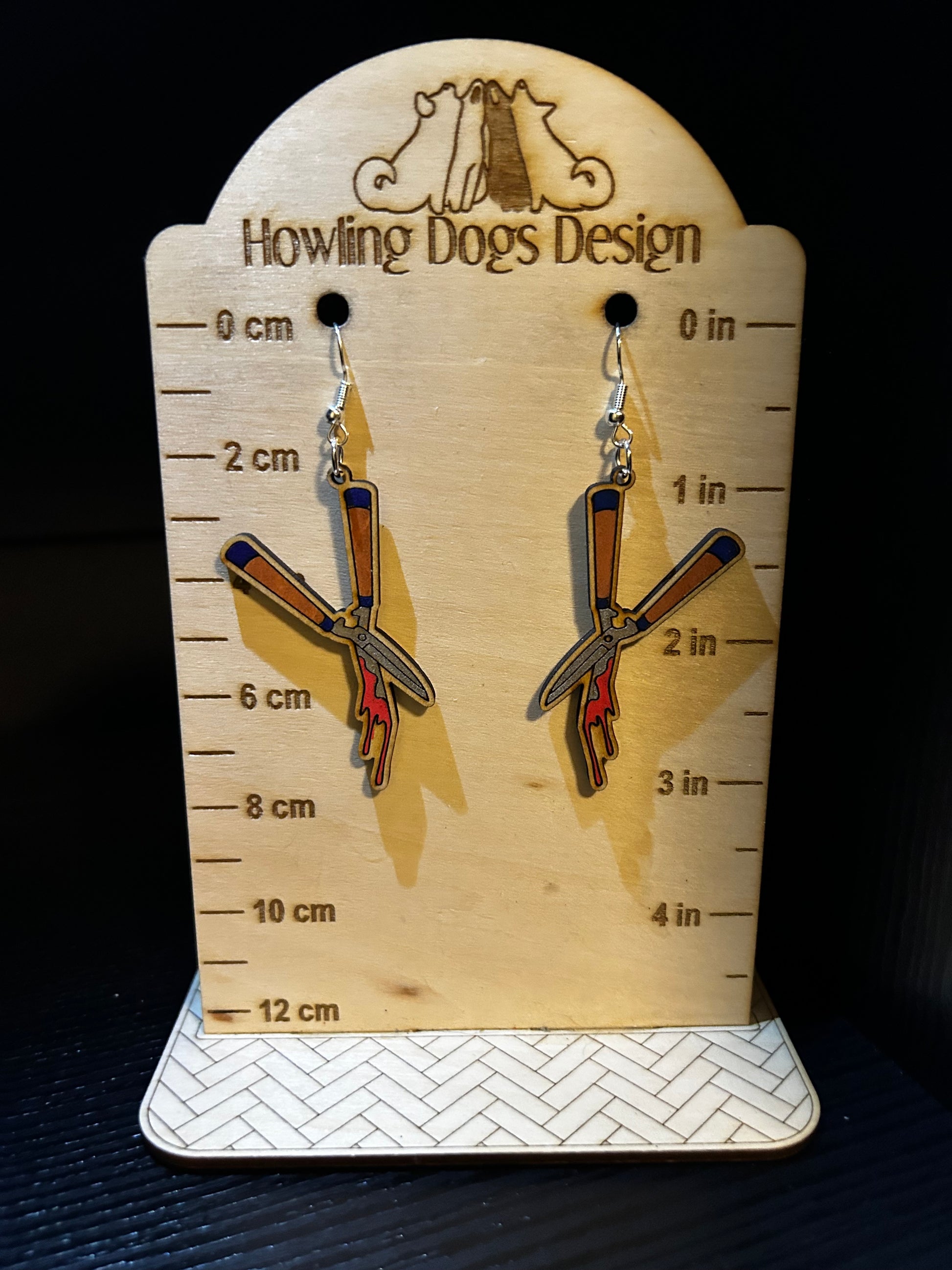 Add a unique touch to your outfit with our hand painted laser cut wood Bloody clippers Earrings. With a bold design and precise laser cutting, these earrings are sure to make a statement. Perfect for those looking for a one-of-a-kind accessory.