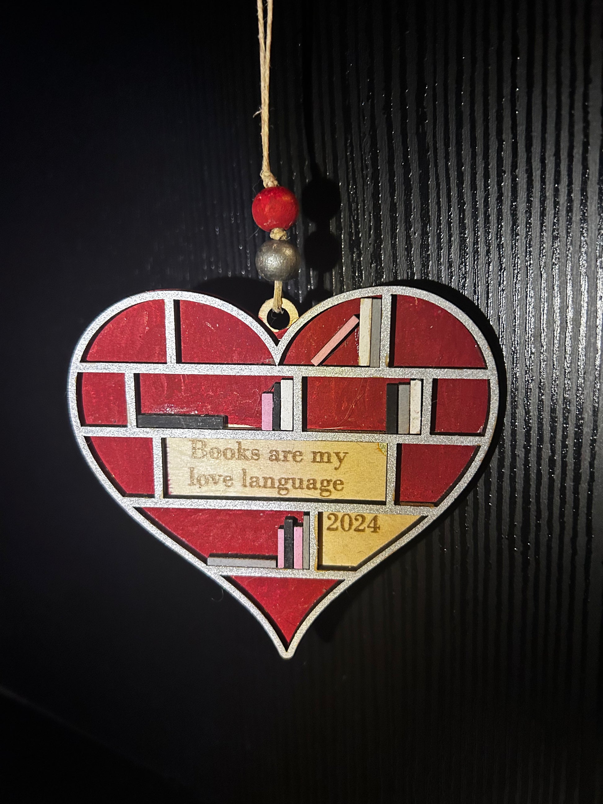 Experience the beauty of literature with our "Books are my love language" Ornament. Made from laser cut wood and hand painted, this ornament is a perfect addition to any book lover's holiday décor. Show your love for books in a unique and elegant way.