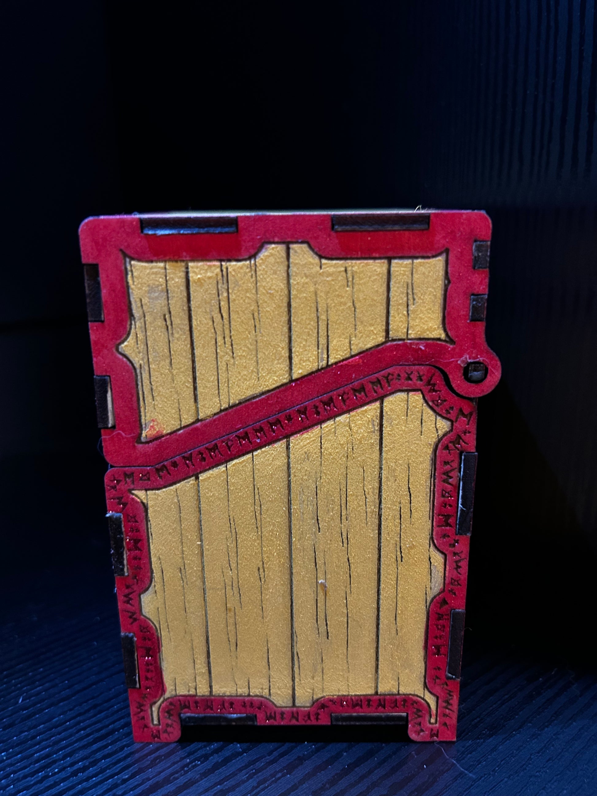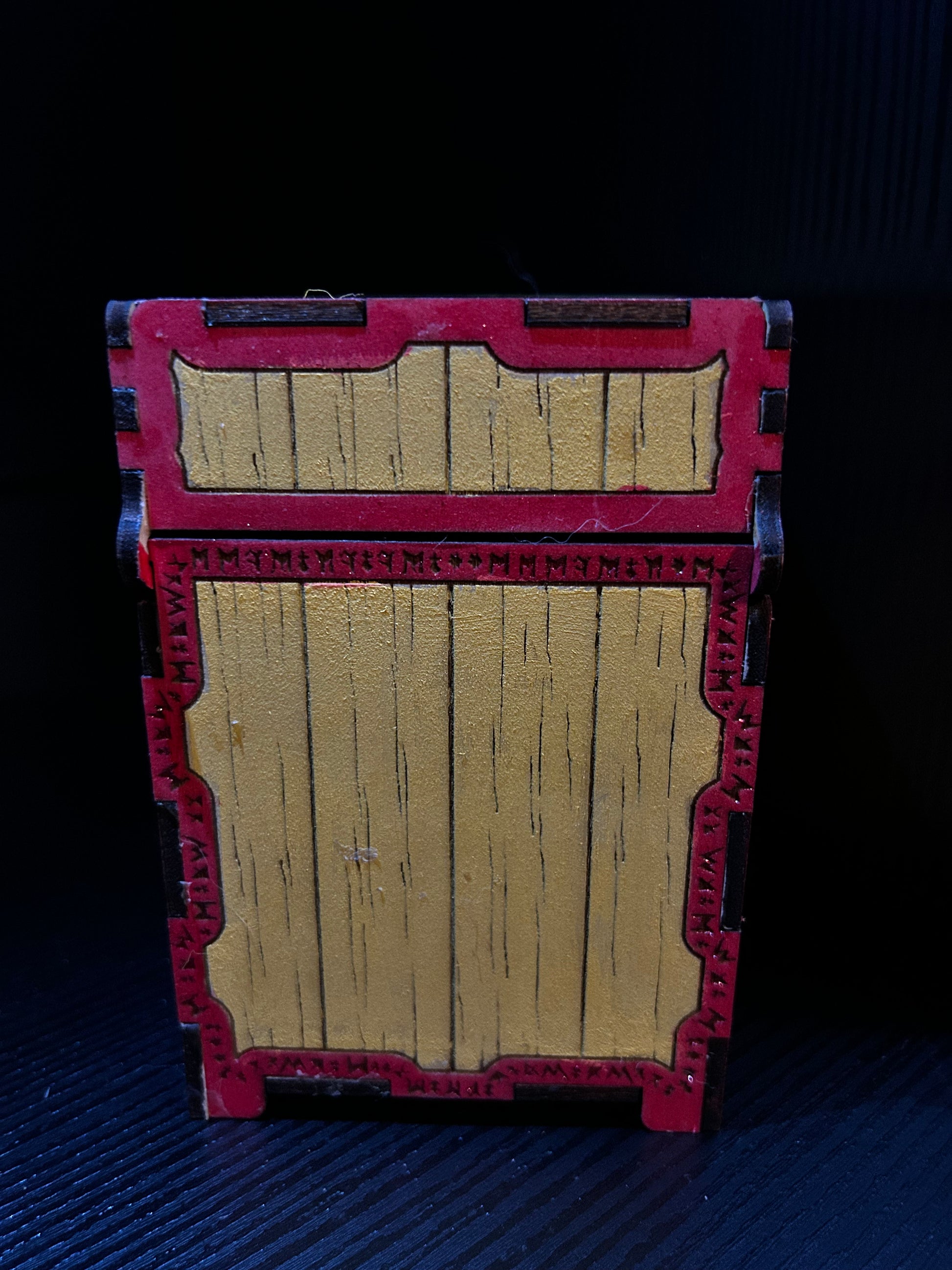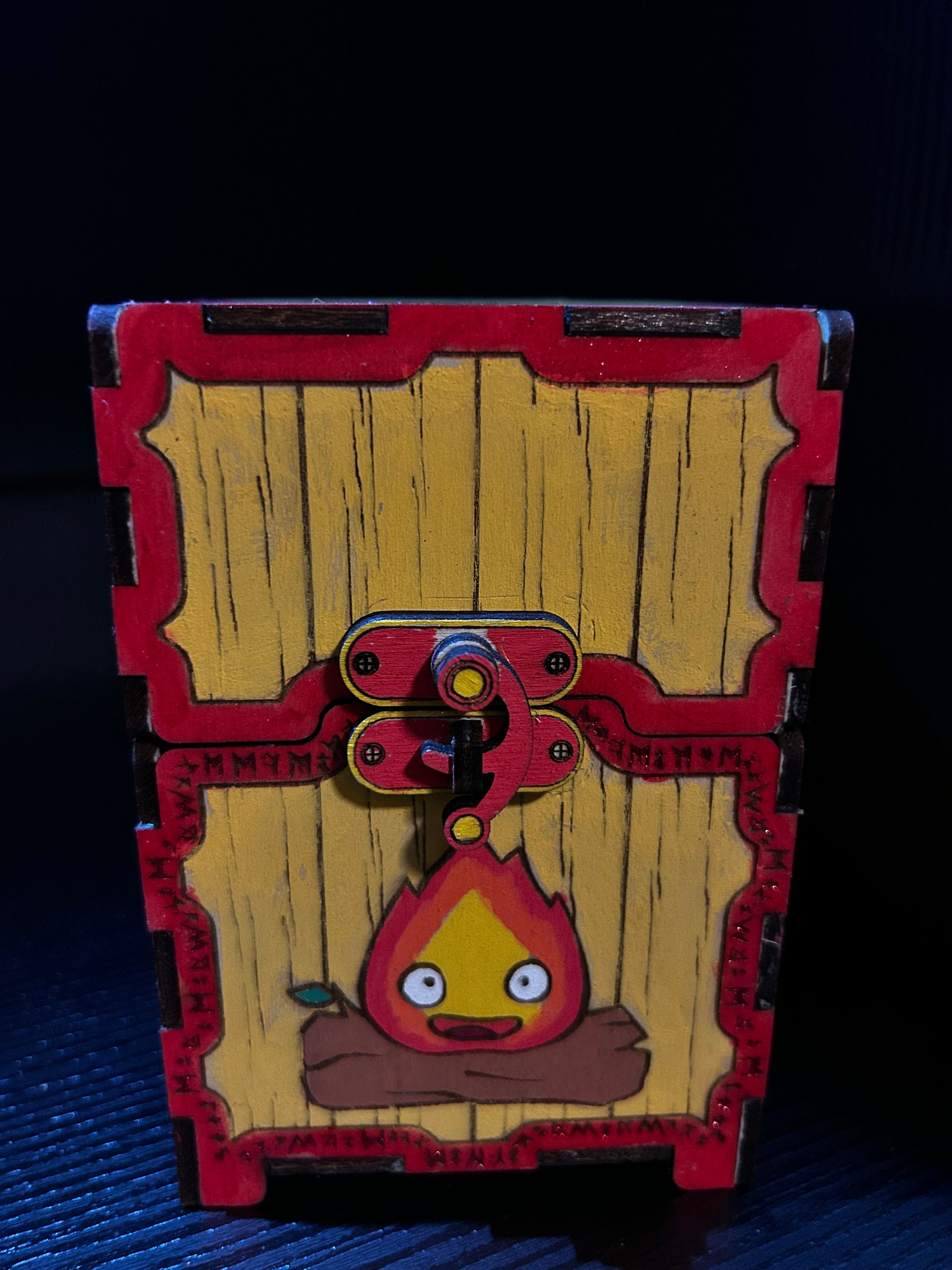 The Calcifer Deck Box is expertly crafted with laser cut wood and hand painted for a unique touch. Keep your cards safe and organized in style. Featuring a one-of-a-kind design, this box is perfect for any card enthusiast. Elevate your game with the Calcifer Deck Box.