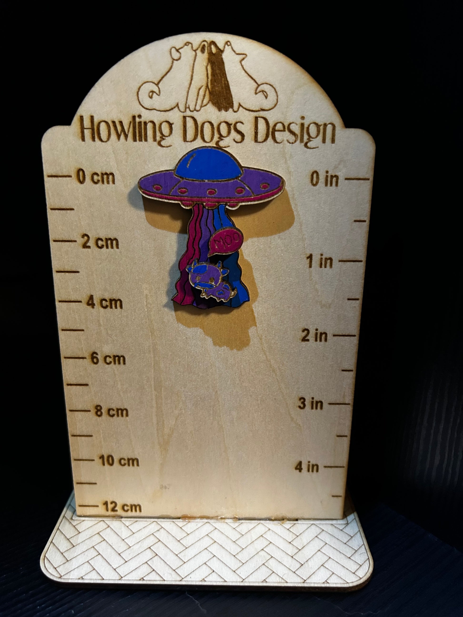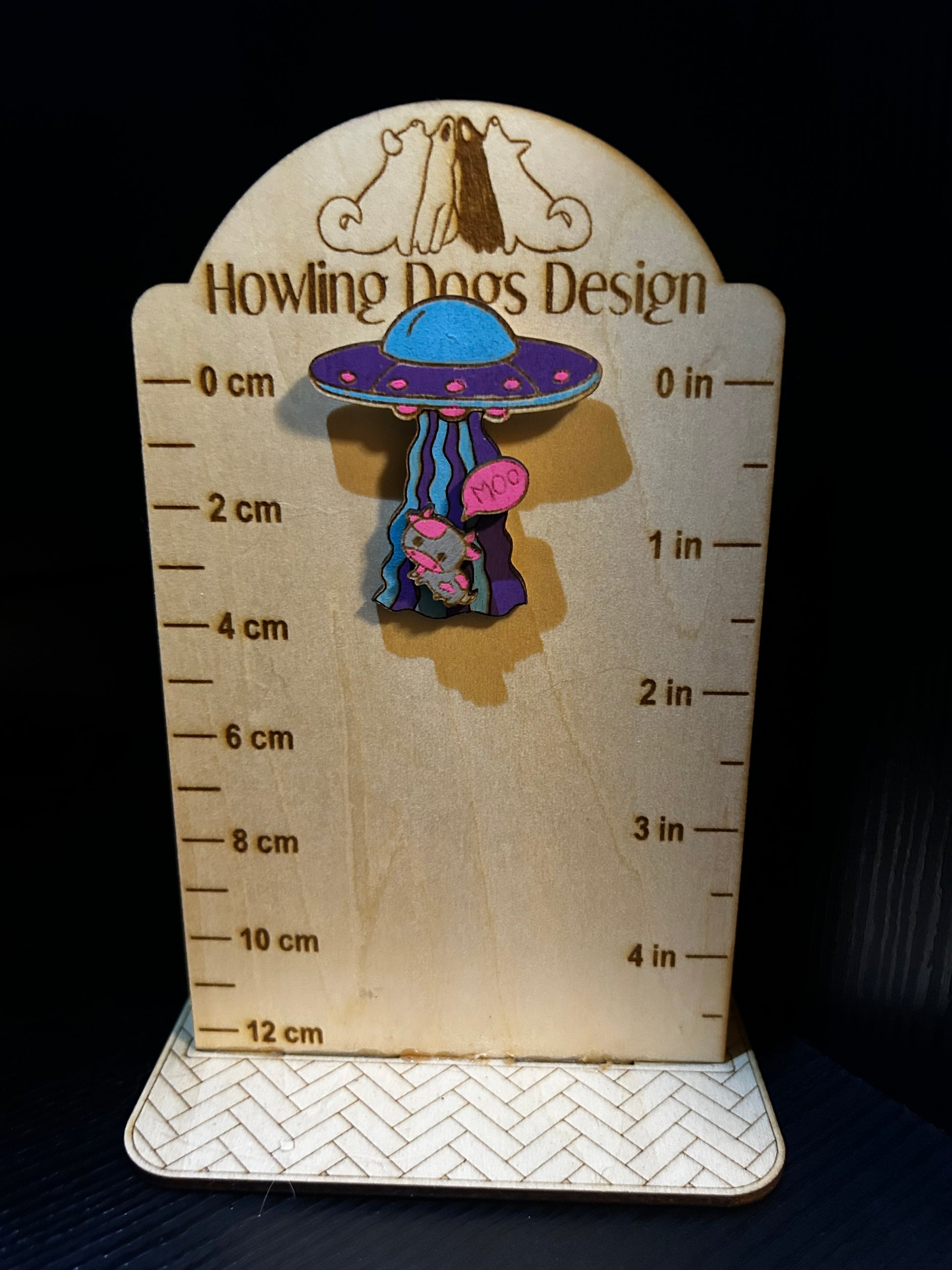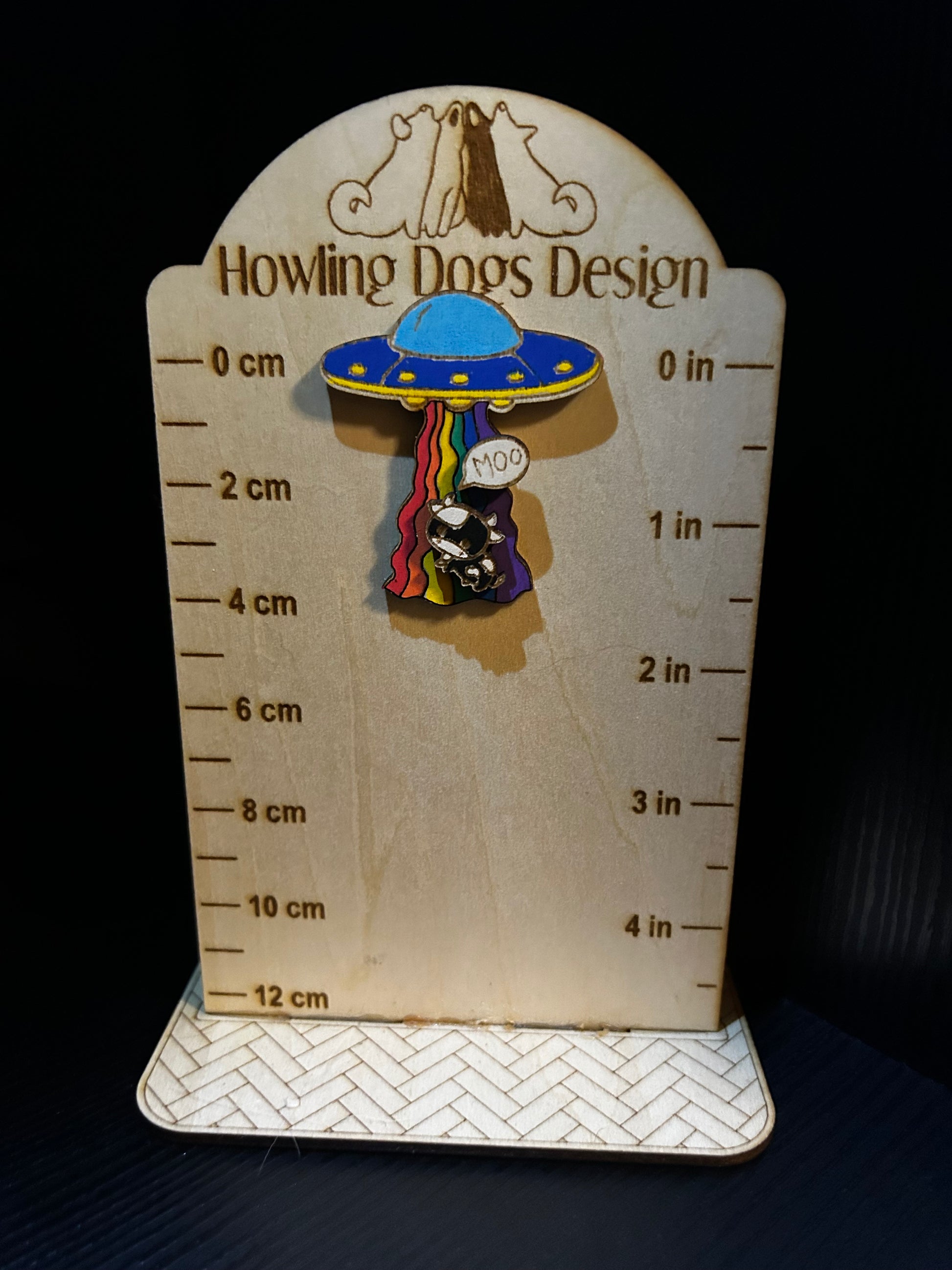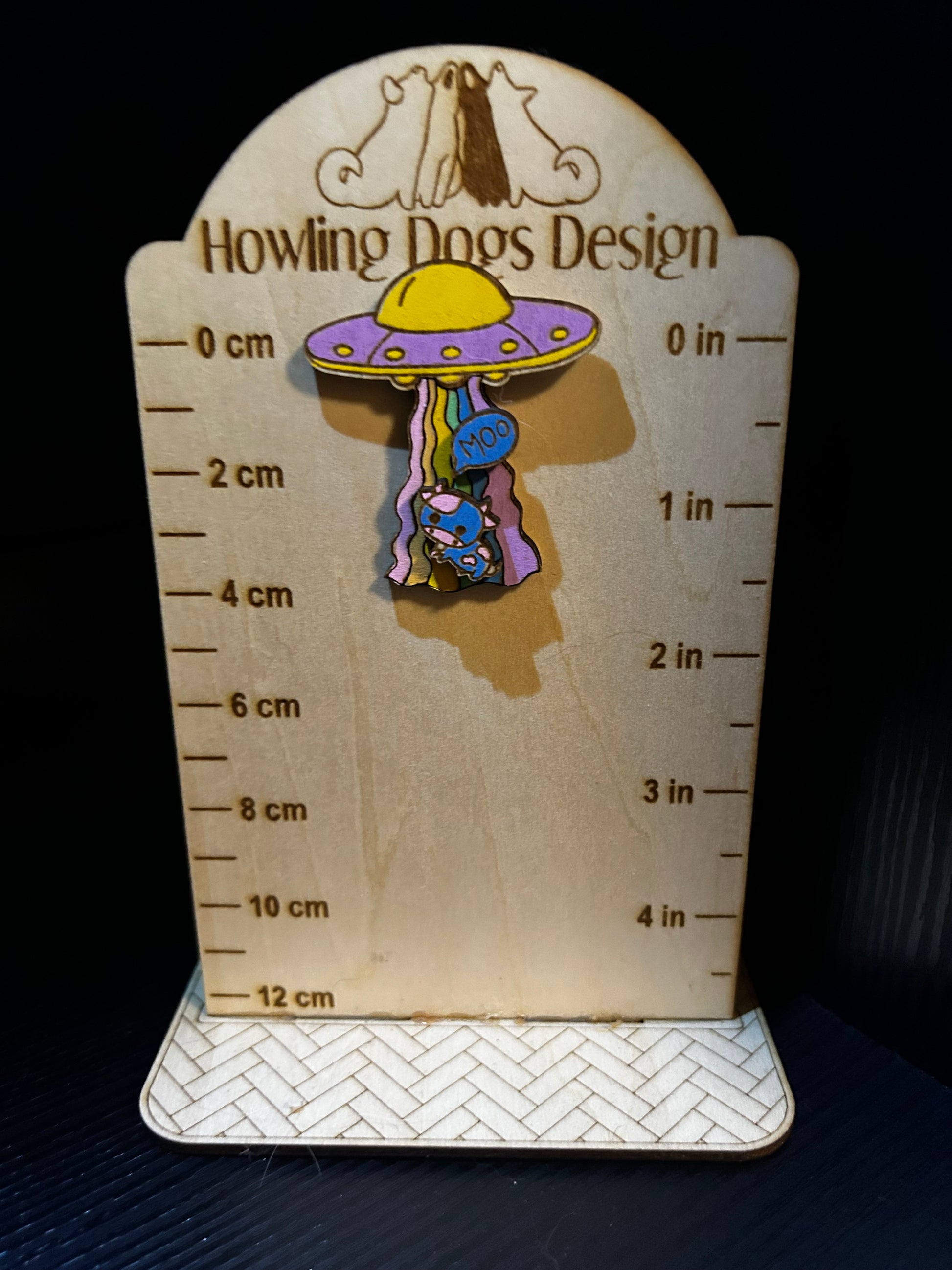 Expertly crafted and hand-painted, our Cow Abduction Pin is a unique addition to any pin collection. Made from laser-cut wood, this pin features a cow being abducted by an alien spacecraft. Perfect for sci-fi enthusiasts and collectors alike.
