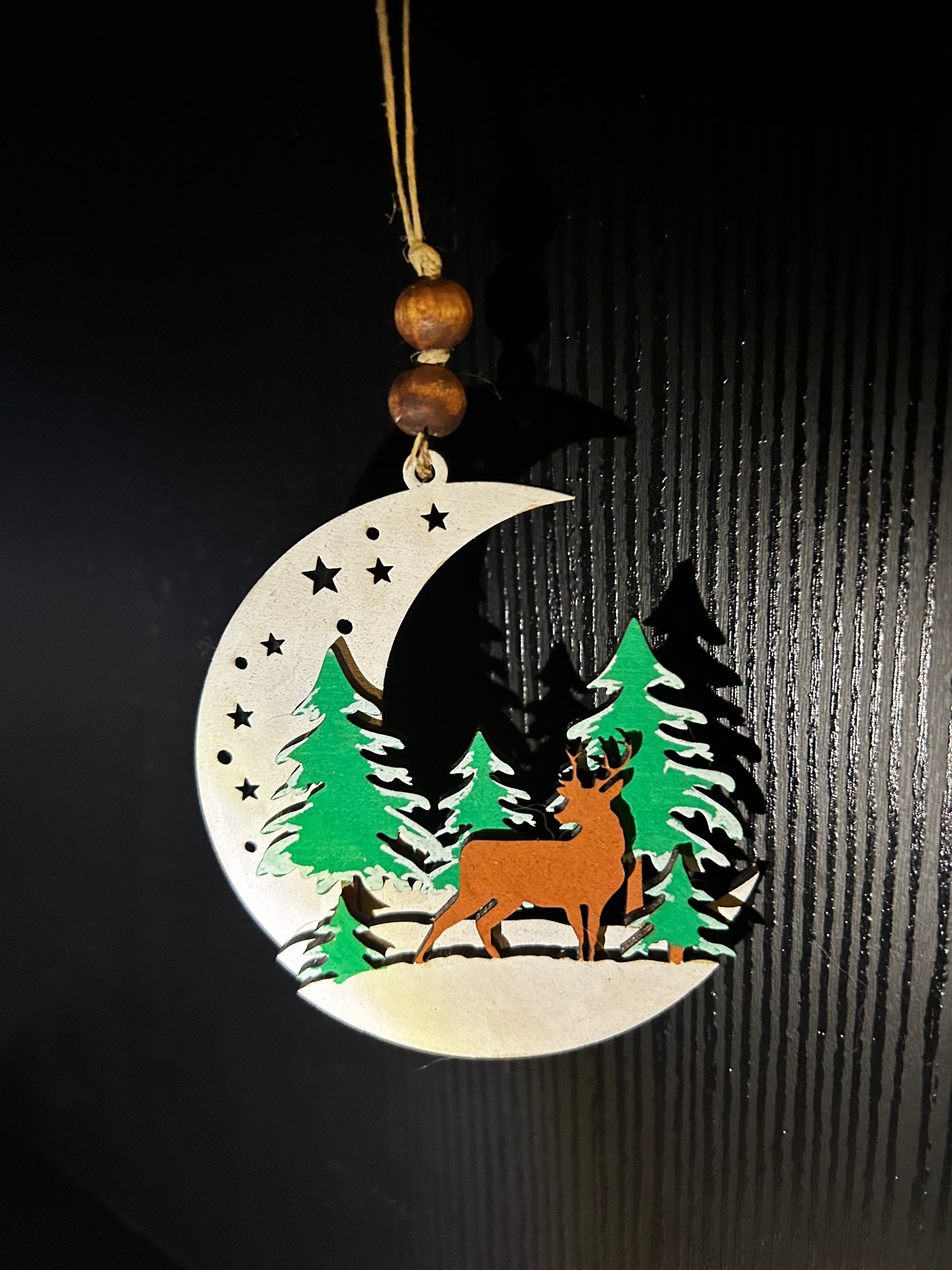 Expertly crafted with laser cut wood and hand painted with intricate details, this Deer Scene Ornament adds a touch of rustic charm to your holiday decor. Each piece is uniquely made, making it a truly special addition to your collection. Bring the magic of nature into your home with this exquisite ornament.