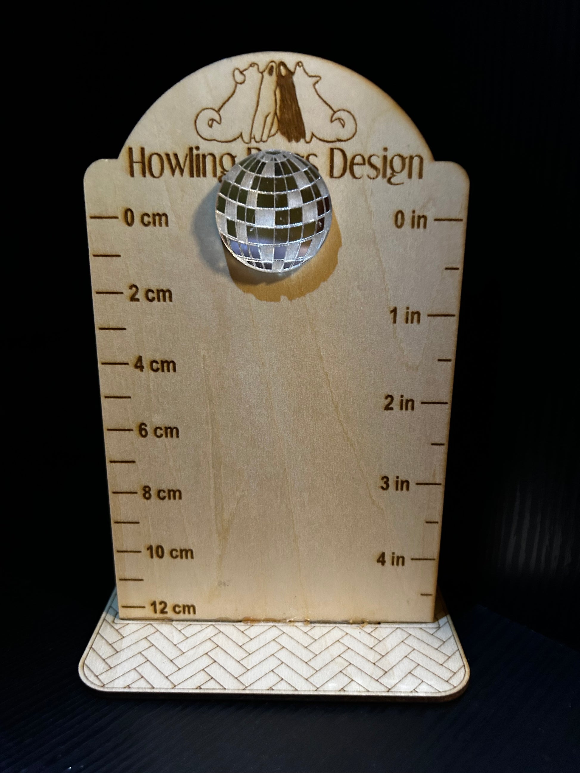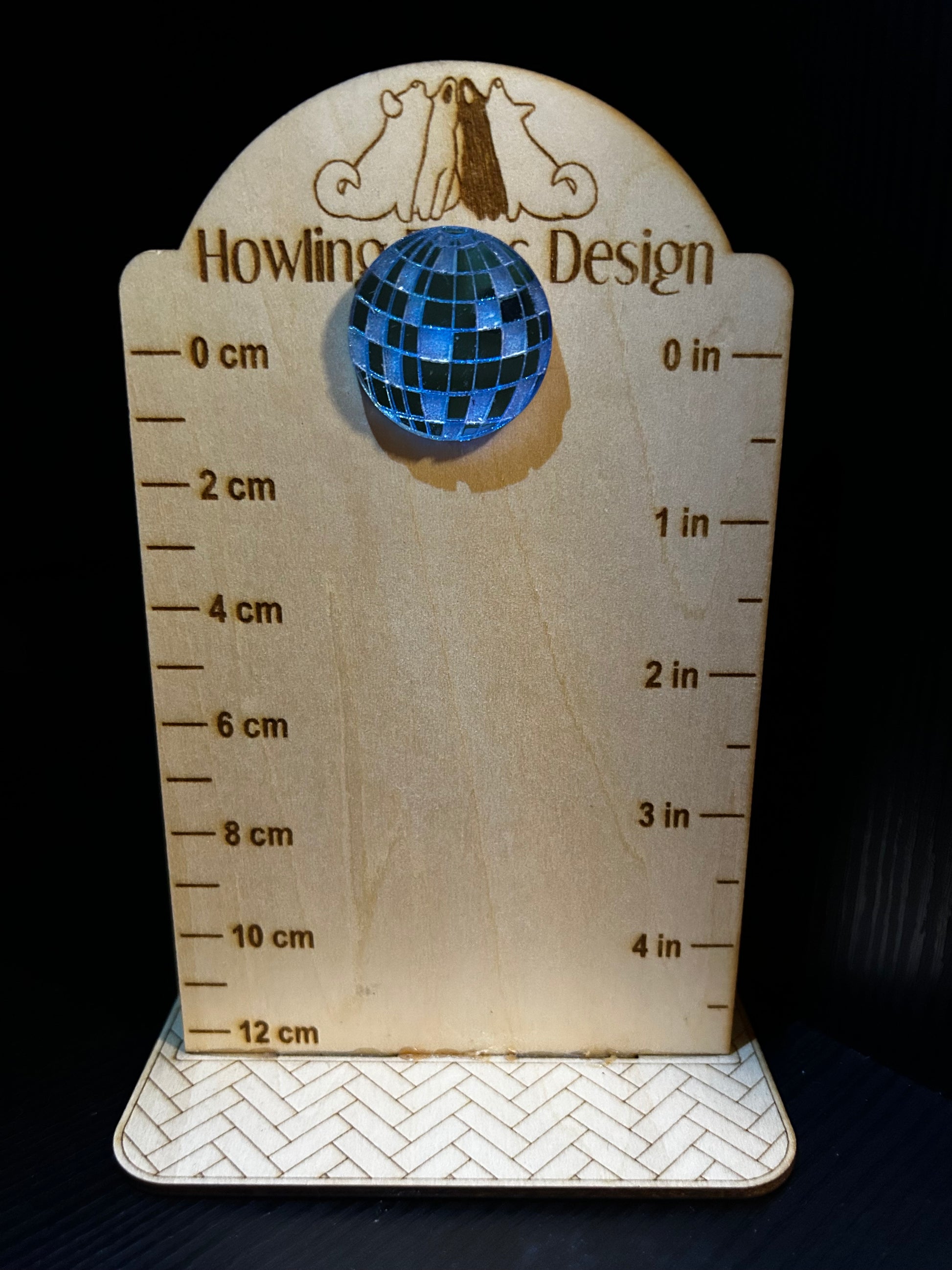 This Disco Ball Pin is laser cut from high-quality acrylic, bringing a touch of sparkle and fun to any outfit. Available in multiple colors, it is the perfect accessory for parties and events. Add a unique and stylish flair to your look with this eye-catching pin.