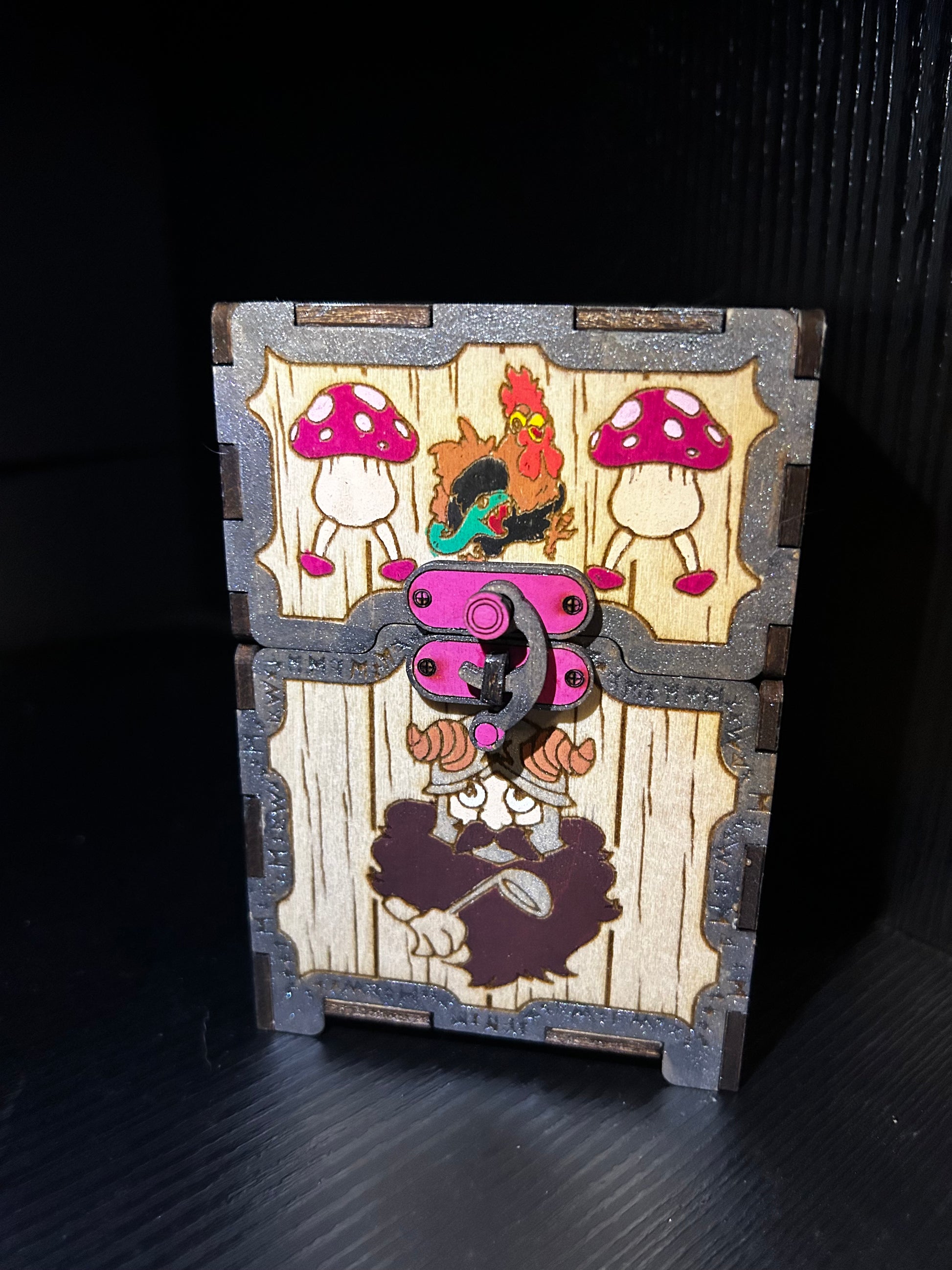 Keep your trading cards safe and secure with the Dungeon Meshi Senshi deck box. Made from laser-cut wood and hand painted with intricate details, this deck box offers both durability and aesthetic appeal. A must-have for any trading card enthusiast.