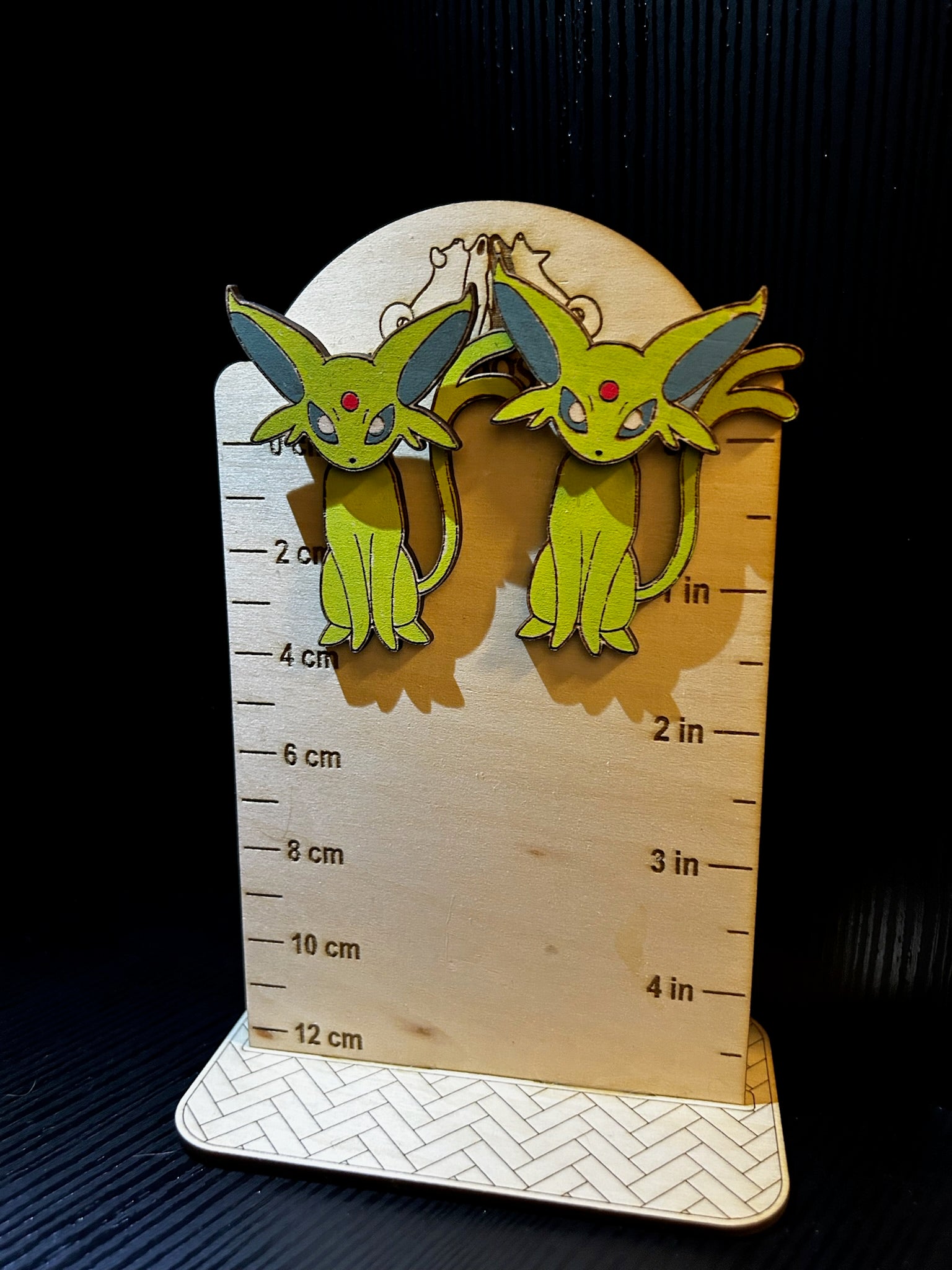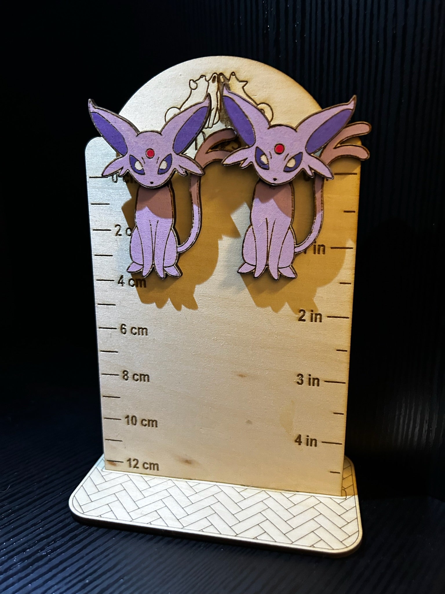 The Espeon Earrings are expertly crafted with laser cut wood and hand painted to perfection. These unique earrings make a statement with their precision and attention to detail. Show off your love for Pokemon with these scientific and objective accessories.