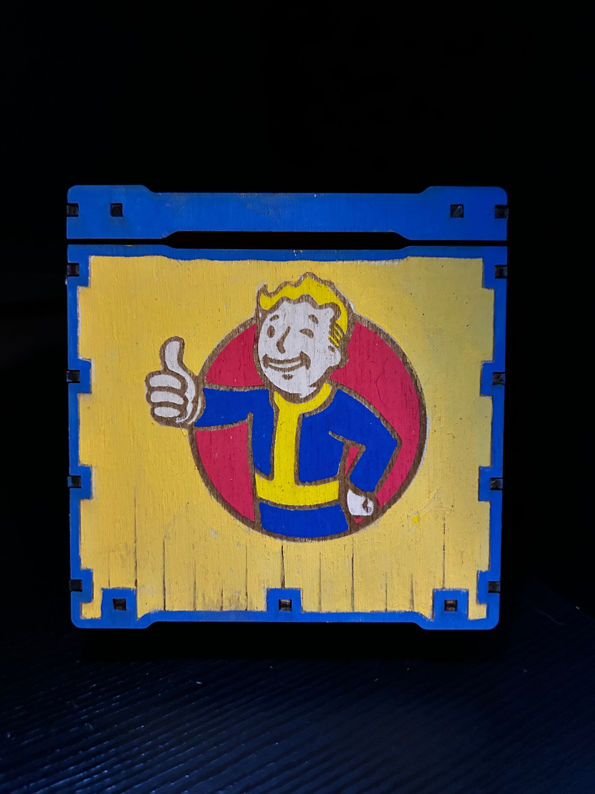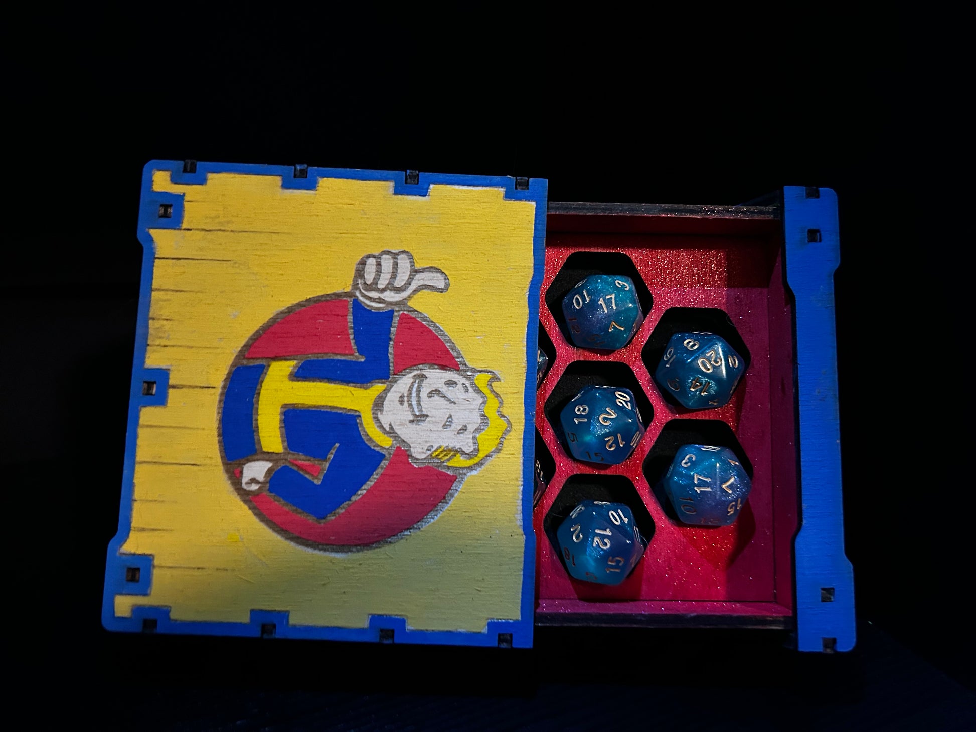 Organize your dice collection with the Fallout Dice Box. This durable and stylish box is perfect for storing and transporting your favorite dice, ensuring they stay safe and secure during your gaming sessions. With its iconic design inspired by the popular video game series, this dice box is a must-have for any Fallout fan.