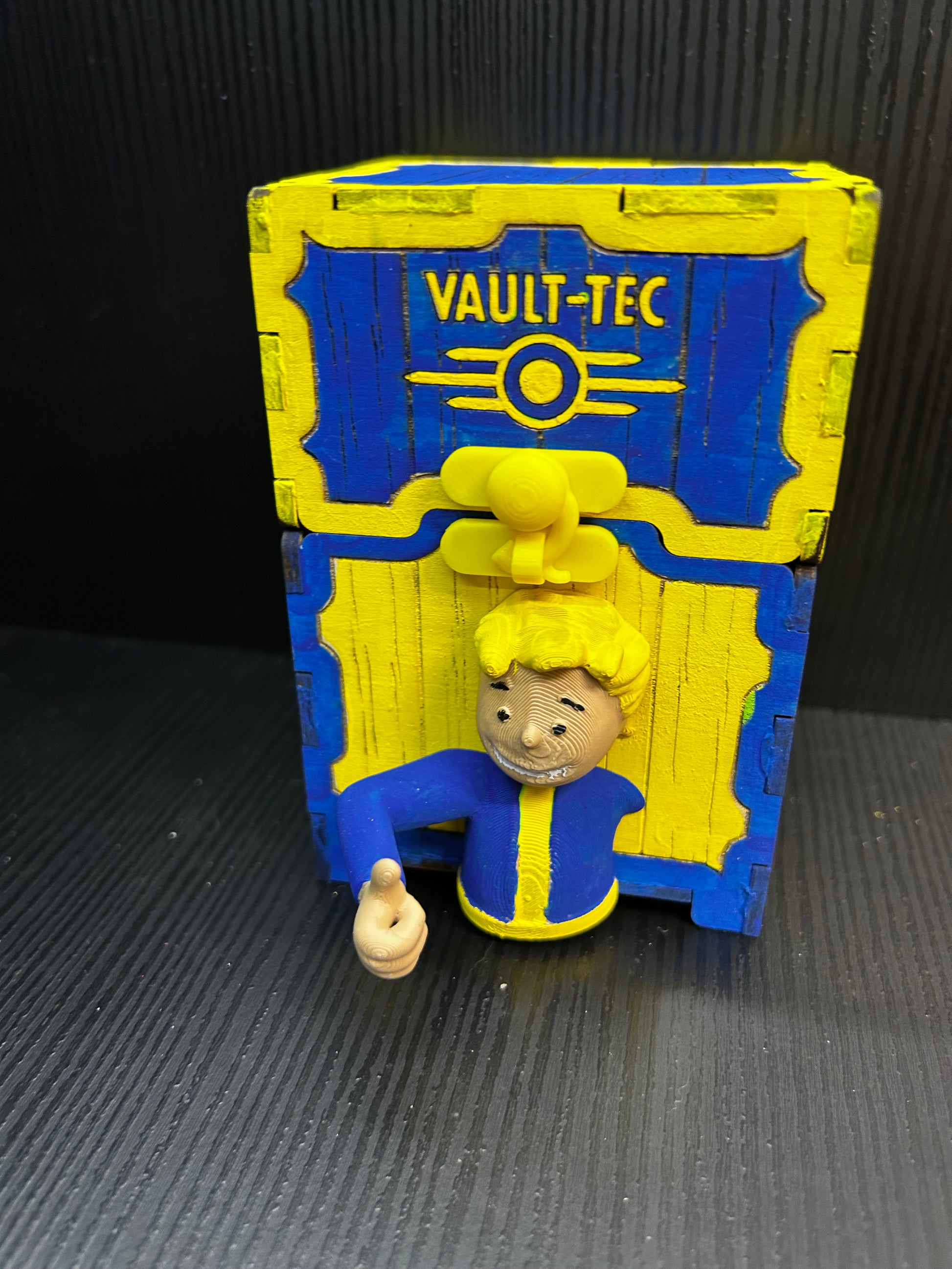 Expertly crafted and hand-painted, the Fallout Vault Boy Deck Box is a must-have for any fan of the iconic game. Made with laser cut wood and 3D printed features, this deck box will keep your cards protected while showcasing your love for the game. A perfect addition to any gaming collection.