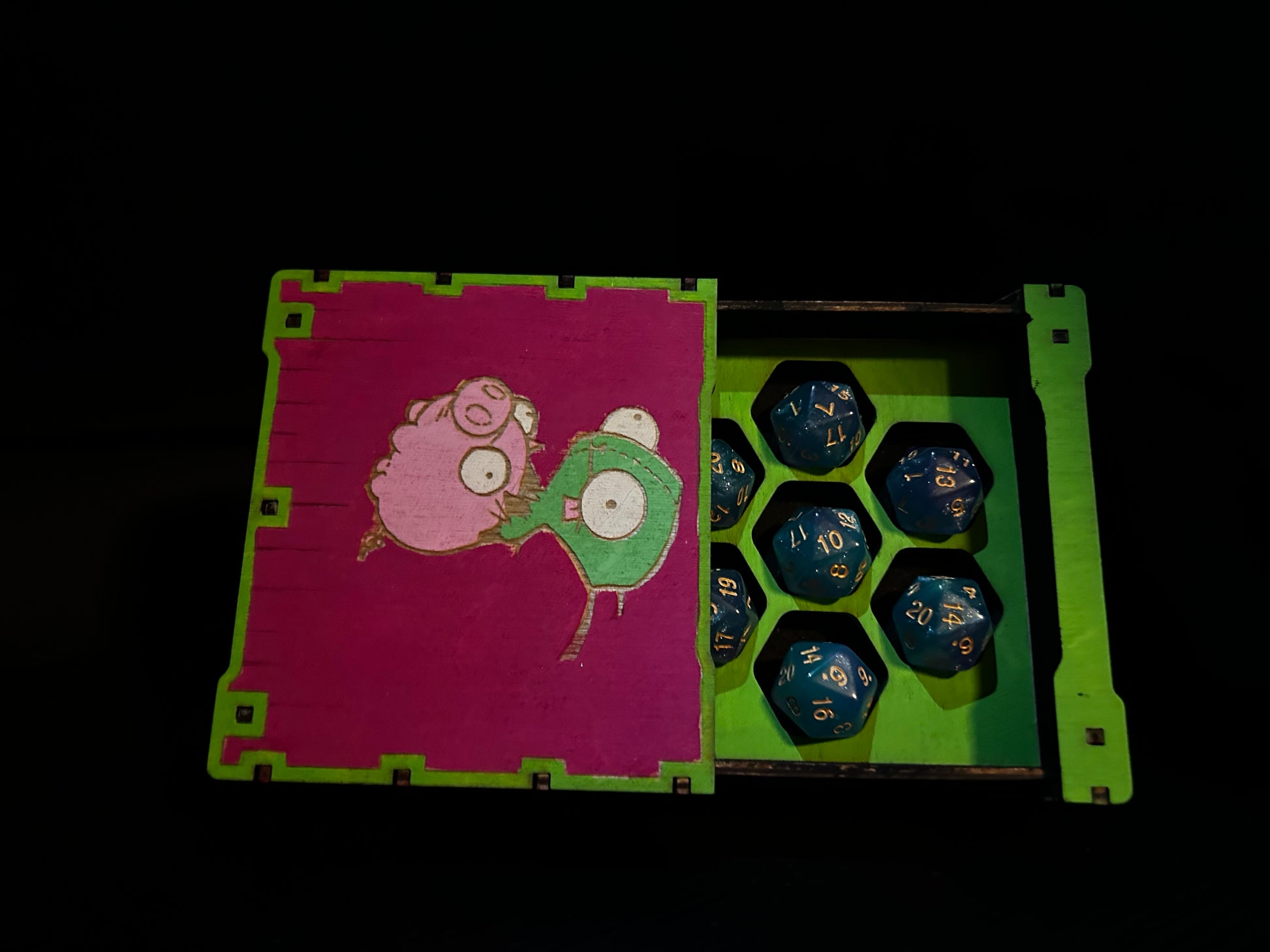 Expertly crafted and hand painted, the Gir Dice Box is a must-have for any Invader Zim fan. Made from laser cut wood, this unique and durable piece showcases the lovable character, Gir. Keep your dice safe and stylish with this one-of-a-kind collectible.
