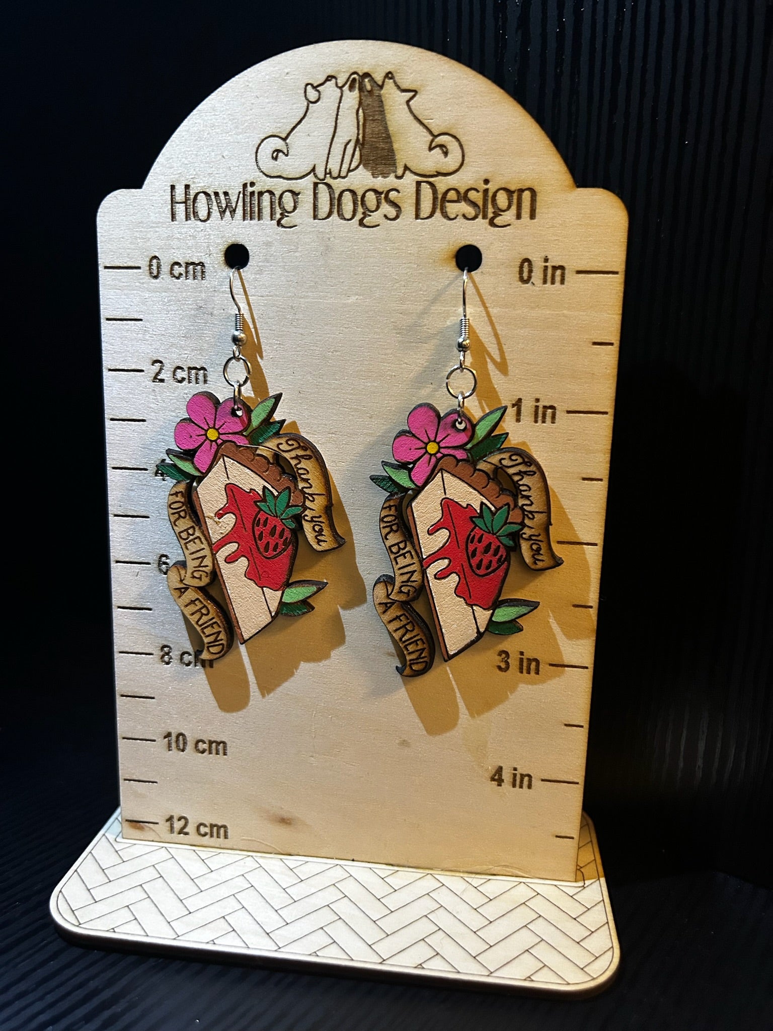 Indulge in some sweet nostalgia with our Golden Girls Cheesecake earrings. These hand-painted, laser-cut wood earrings feature a charming depiction of the iconic dessert from the beloved TV show. Perfect for adding a touch of retro chic to any outfit.