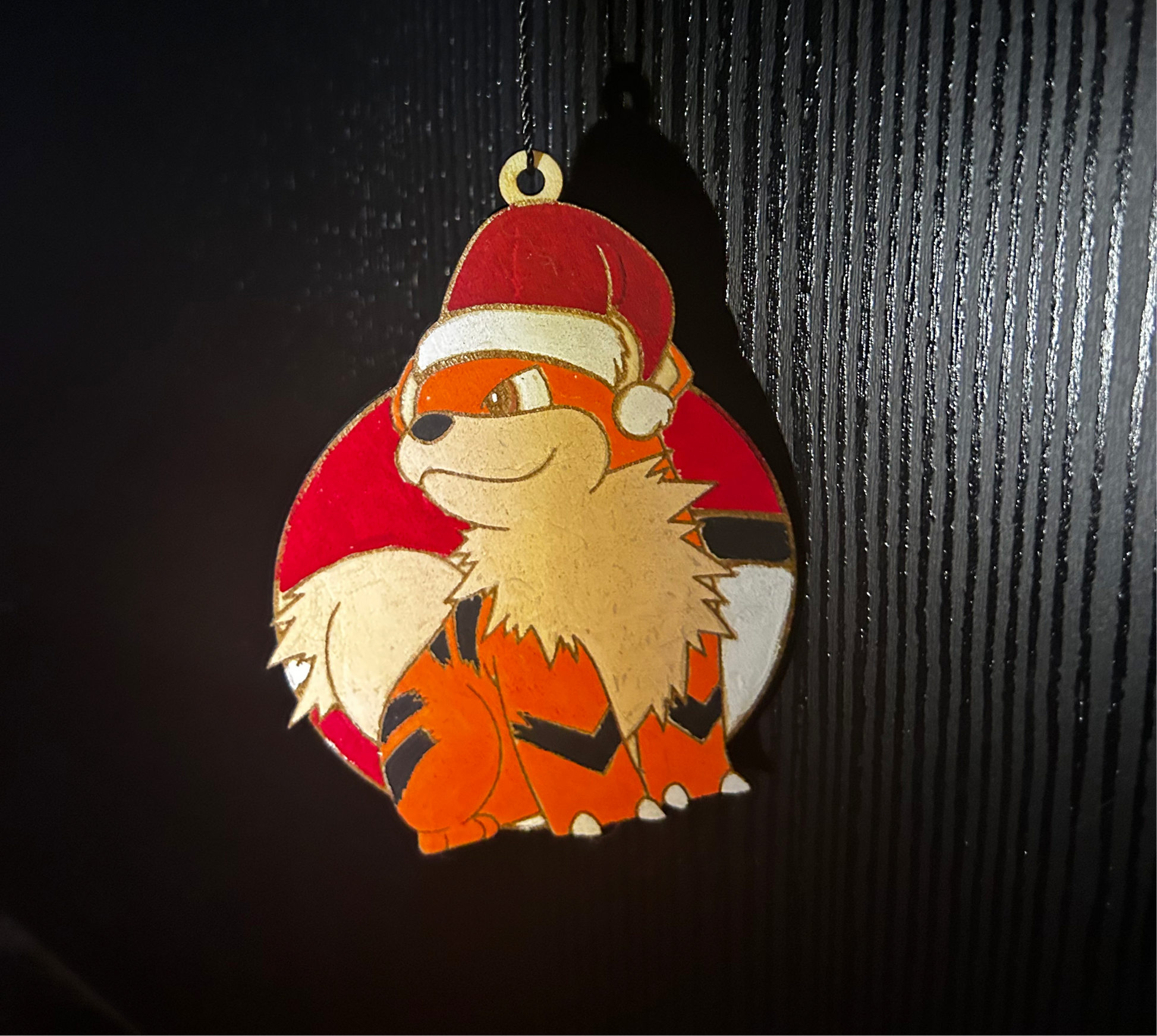 This Growlithe Pokemon ornament is expertly crafted from laser cut wood and hand painted for a unique and detailed finish. With precise detailing and skilled craftsmanship, this ornament is a must-have for any Pokemon fan. Add a touch of charm and nostalgia to your holiday decor with this one-of-a-kind piece.