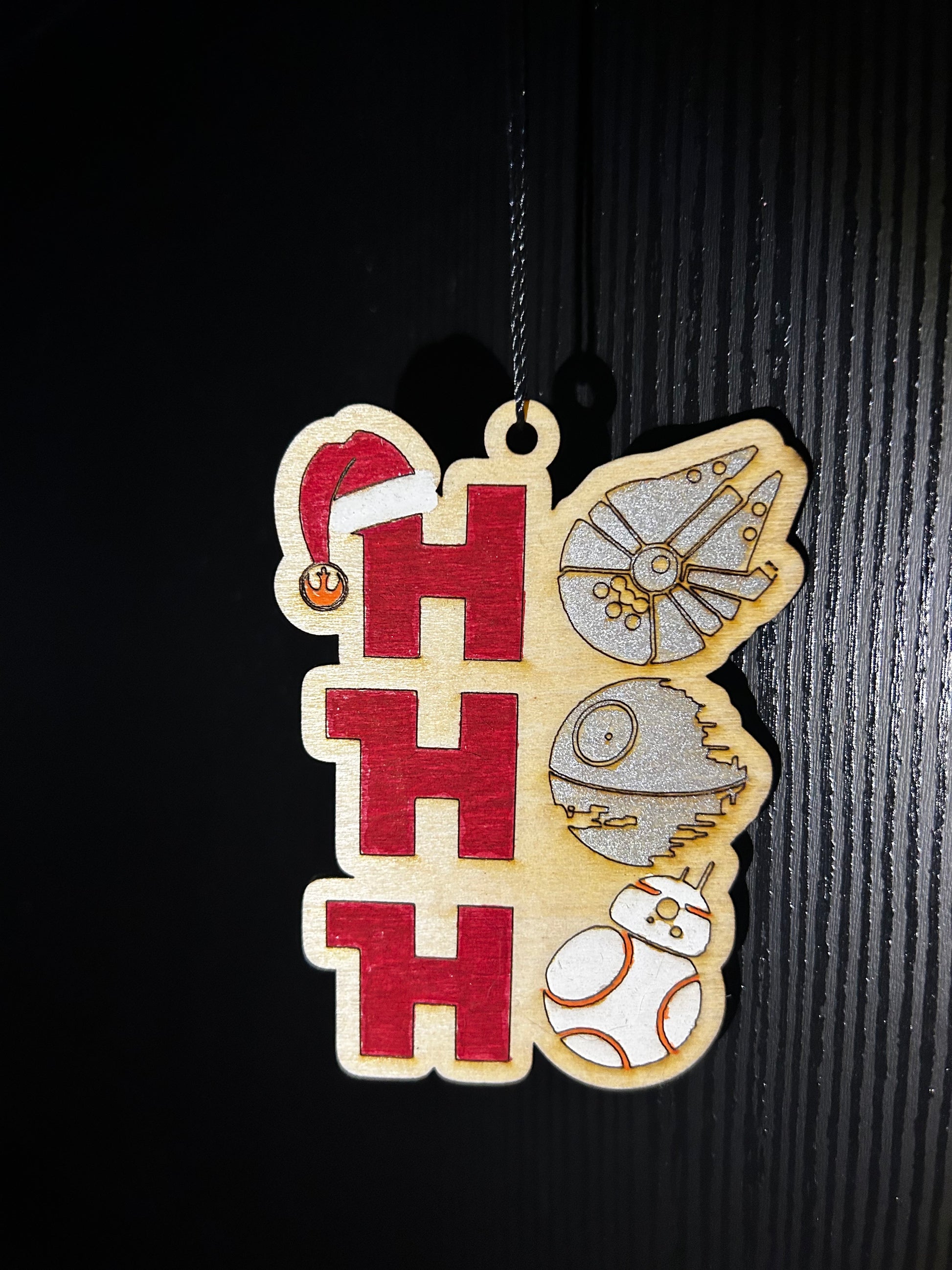 Expertly crafted with laser-cut wood and hand-painted with precision, the Ho Ho Ho Star Wars ornament brings your favorite characters to life on your tree. Add a touch of galactic charm to your holiday décor with this unique and beautifully designed ornament.
