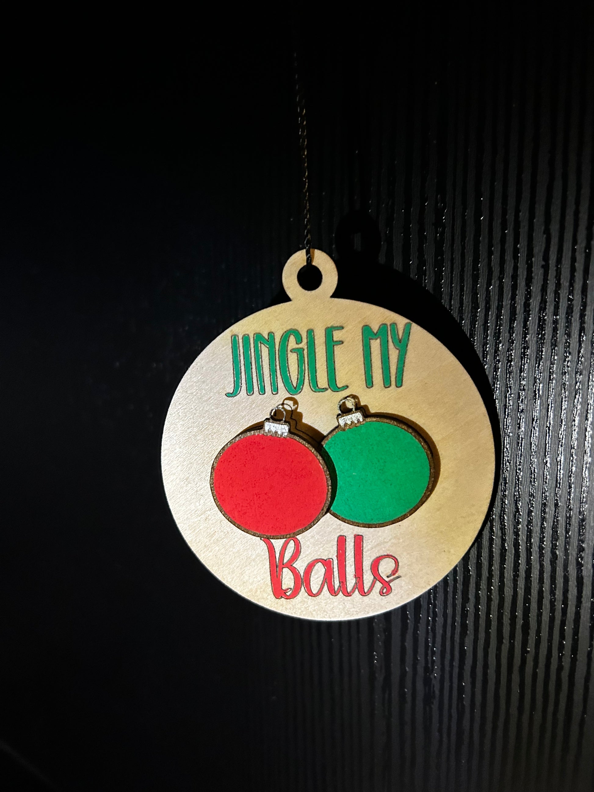 Enhance your holiday decor with our Jingle My Balls Ornament. Made from laser cut wood and hand painted for a unique touch, it's the perfect addition to any Christmas tree. With its intricate design and attention to detail, this ornament will be a standout piece on your tree.