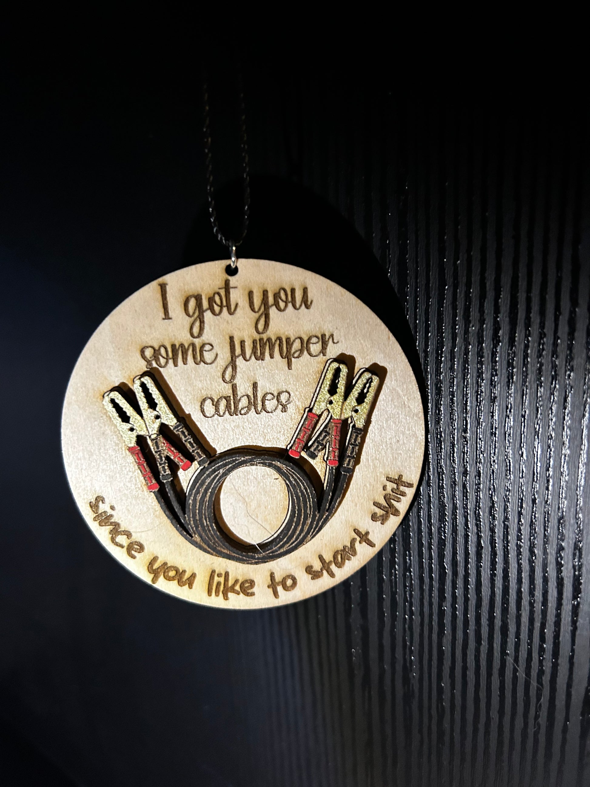 Crafted with precision and care, this Jumper Cables Ornament features laser-cut wood and hand-painted silliness. Its unique design makes for a fun and eye-catching addition to any holiday tree. Add a dash of humor and personality to your decor.
