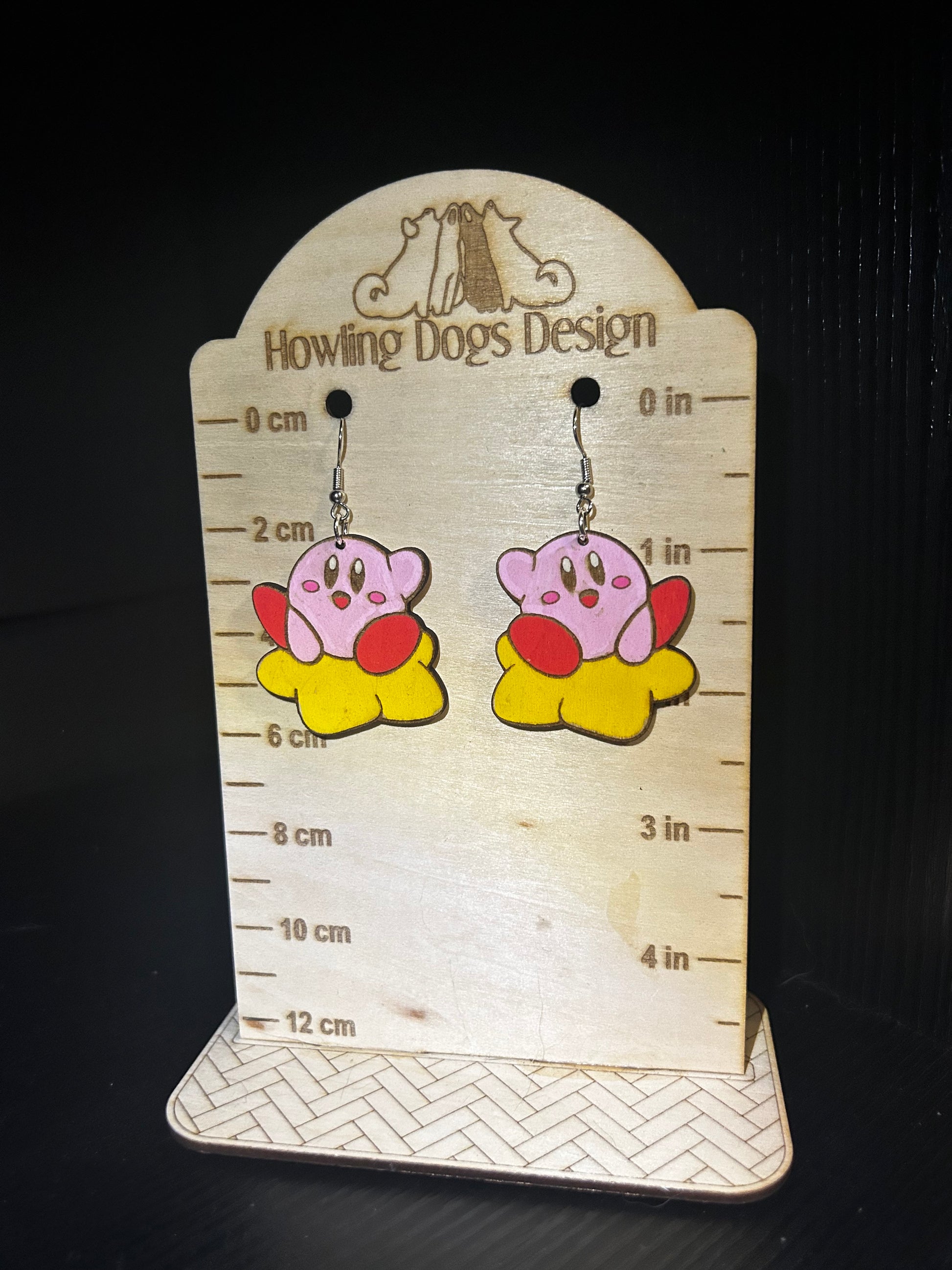 Expertly crafted Kirby Earrings made from laser cut wood and hand painted for a unique touch. These earrings are sure to make a statement and complete any look with their intricate design. Add a touch of art and style to your everyday outfits.
