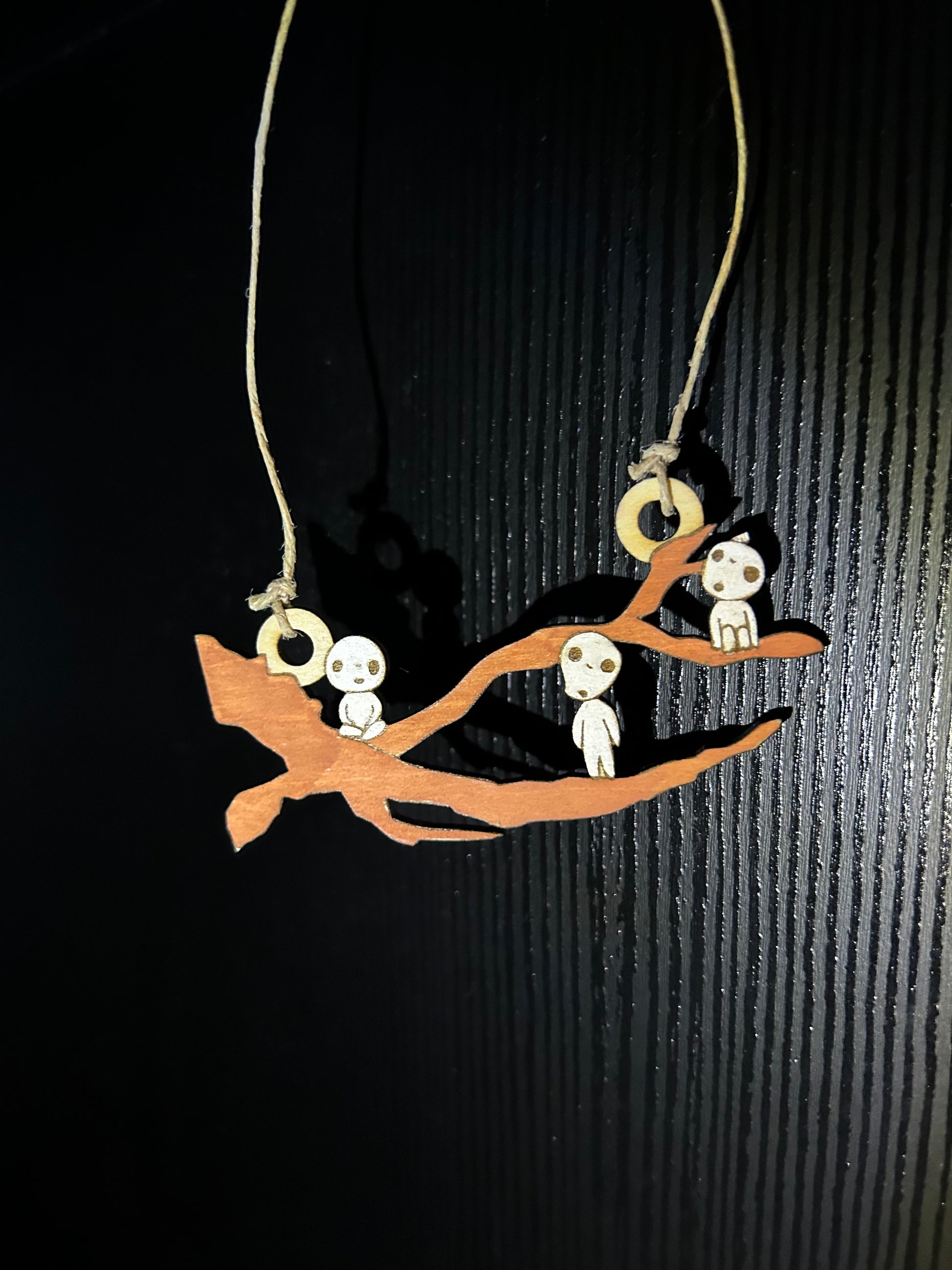 Add a touch of magic to your home with the Kodama in tree ornament. Handcrafted and painted, this laser cut wood piece features a scene from Princess Mononoke. Bring the enchantment of Studio Ghibli into your decor with this unique and beautiful ornament.