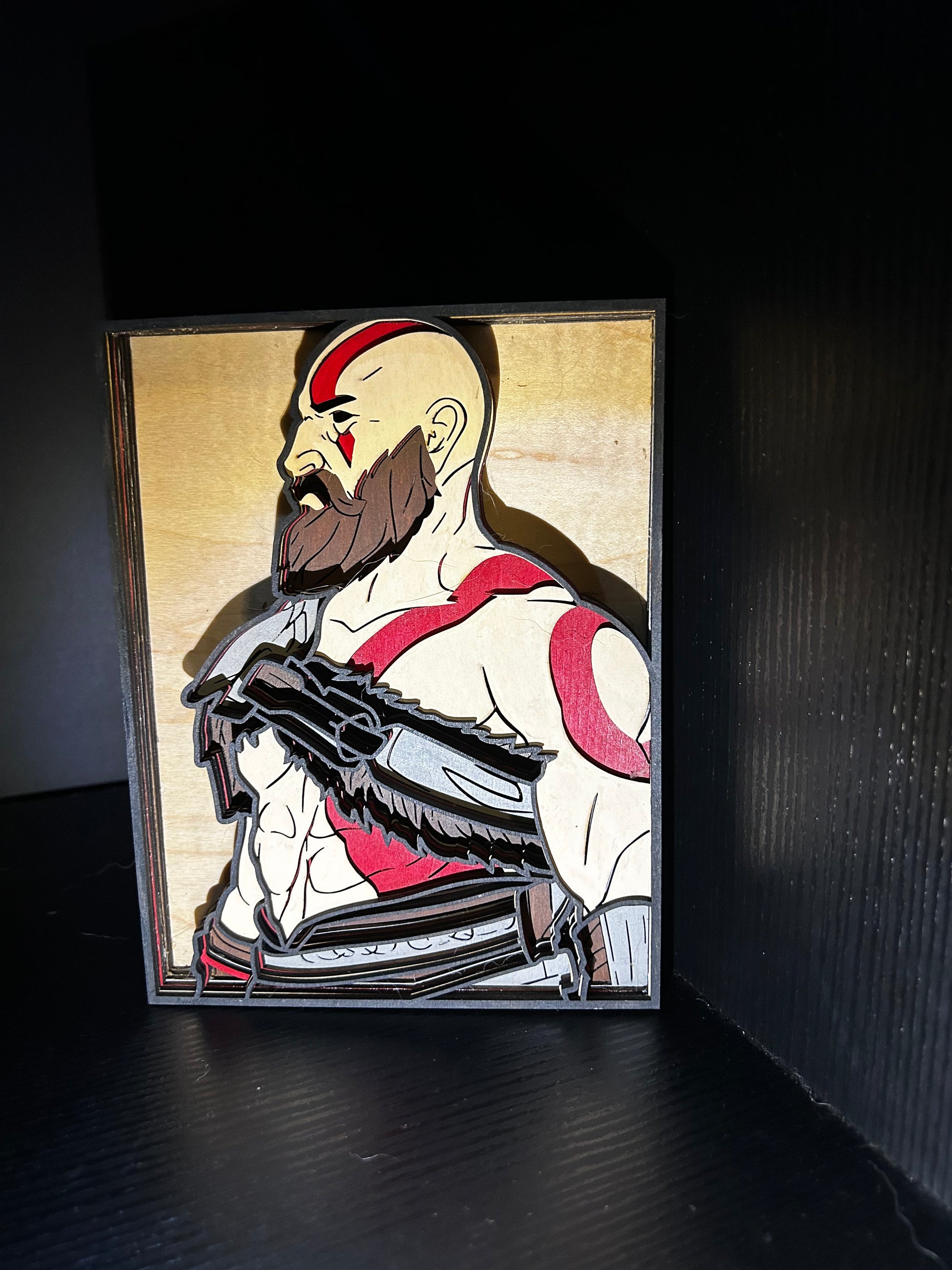 "Experience the power and craftsmanship of Kratos God of War with our layered artwork. Each piece is laser cut from wood and hand painted, bringing the fierce deity to life. Own a unique and stunning piece of art that showcases your love for the game."