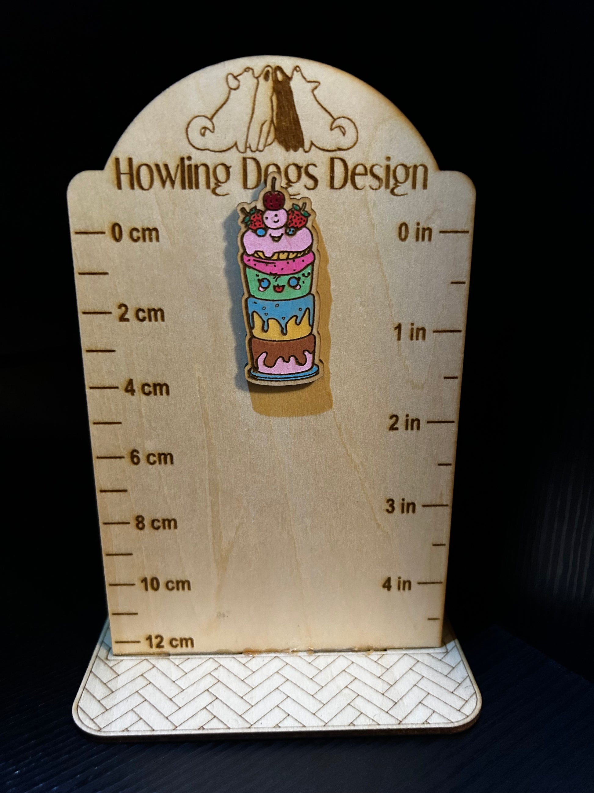 This layered cake pin with plate is a kawaii accessory that combines laser cut wood and hand painting to create a unique and playful look. With its intricate layers and cute design, it's the perfect addition to any accessory collection.
