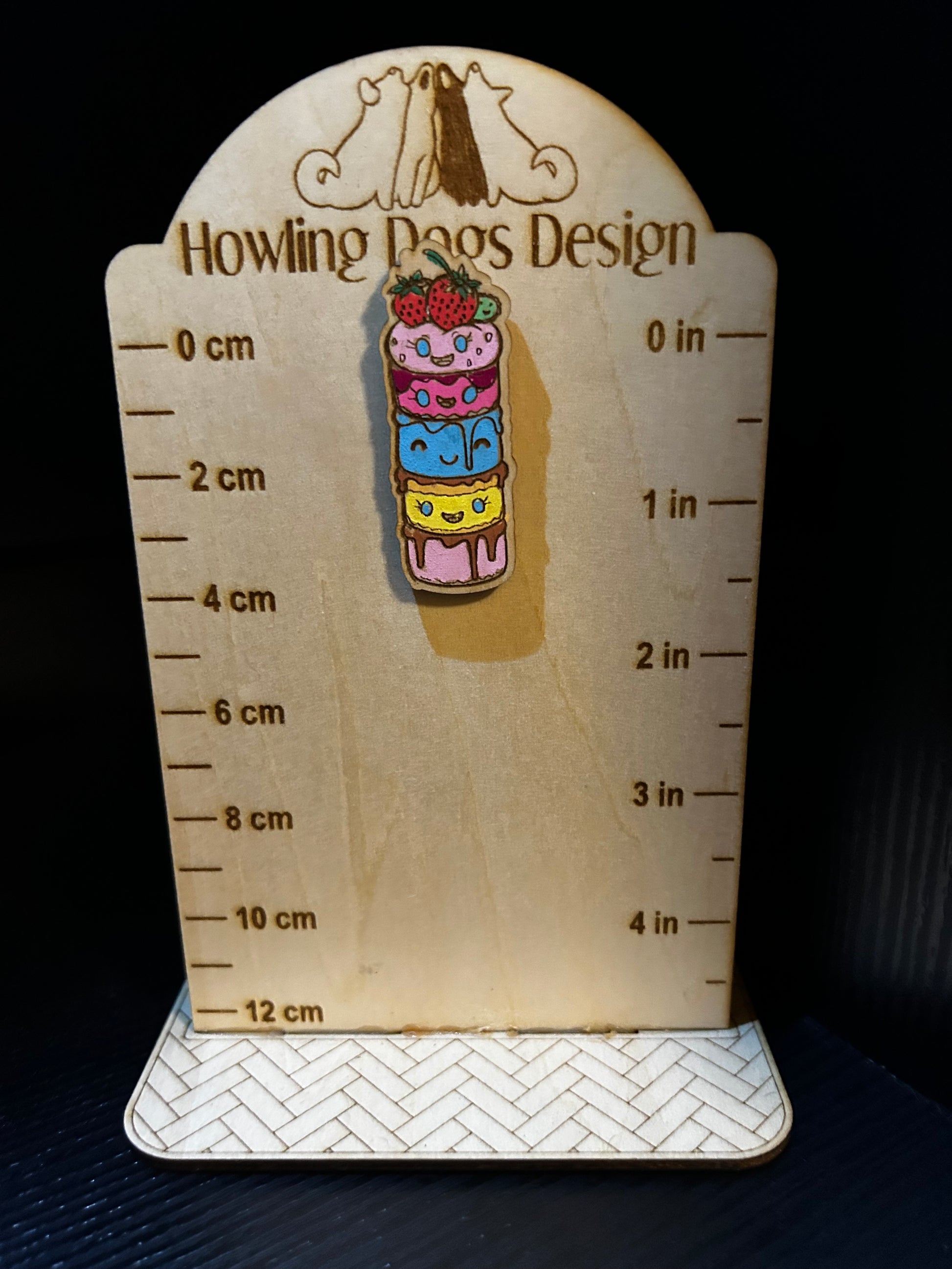 This layered kawaii cake pin is expertly crafted from laser cut wood and hand painted to create a cute and whimsical design. Perfect for any pin collector or fan of kawaii culture, this pin features a mouthwatering cake with strawberries, making it a must-have accessory.