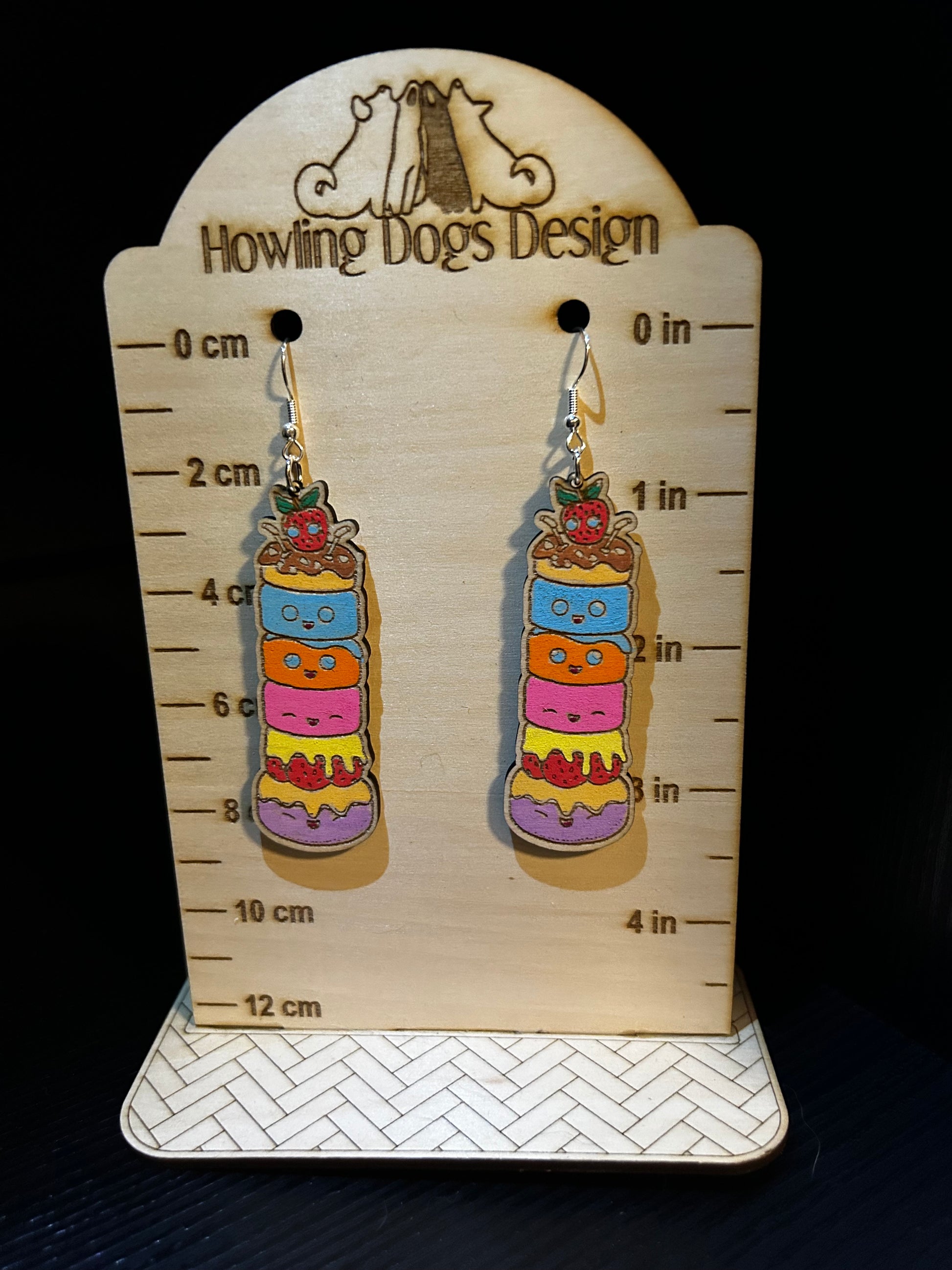 Add a touch of sweetness to your style with these layered cake earrings featuring a delightful strawberry topper. Precision cut from wood and hand painted, these kawaii earrings are a charming addition to any outfit. Bring some fun and playfulness to your look with these unique earrings.