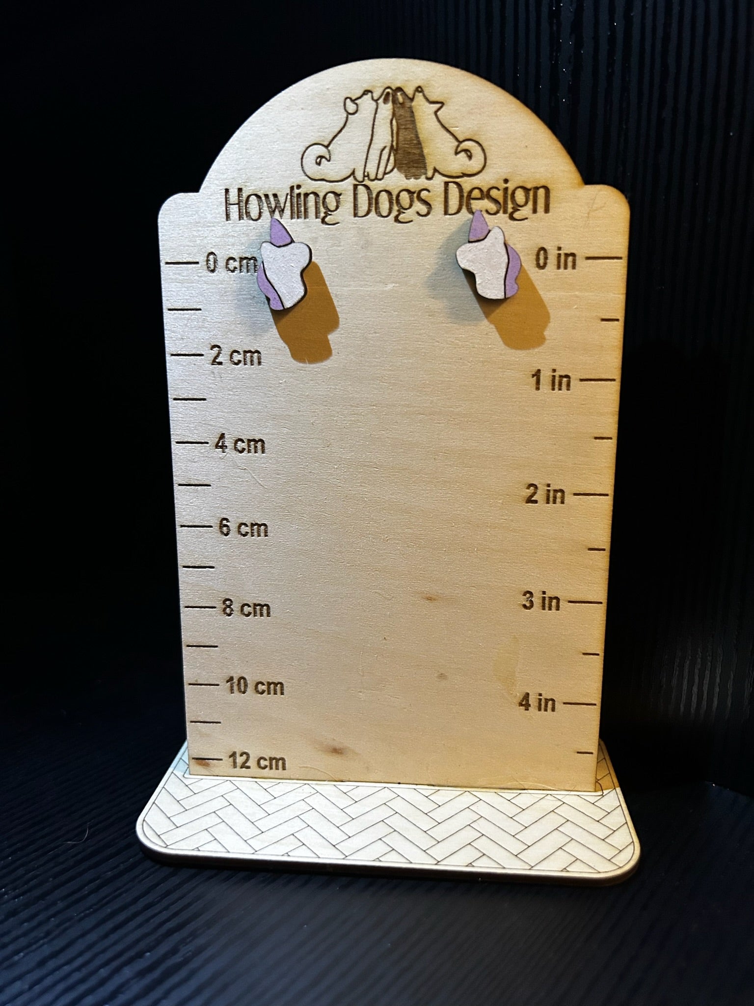 "Add a touch of whimsy to your wardrobe with Lucky Charm Marshmallow Unicorn earrings. Laser cut from wood and hand painted, these earrings are a unique and playful accessory. A must-have for any unicorn lover! Made with precision and care."