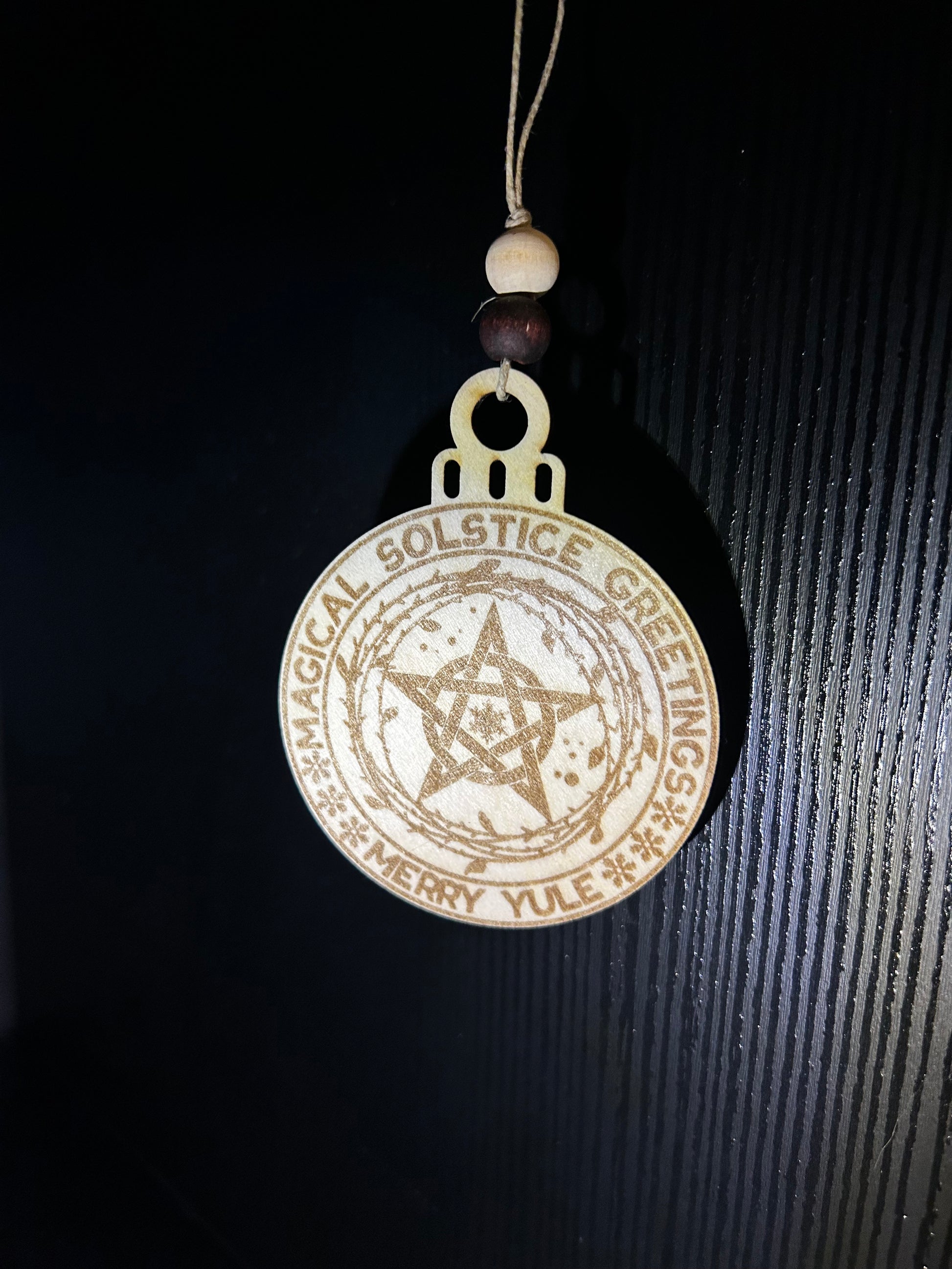 This laser cut wood ornament brings magical solstice greetings to your holiday decor. Crafted with precision and intricate detail, this ornament will adorn your tree and bring a touch of enchantment to your home. Made with high-quality materials, this ornament is a stunning addition to any festive display.