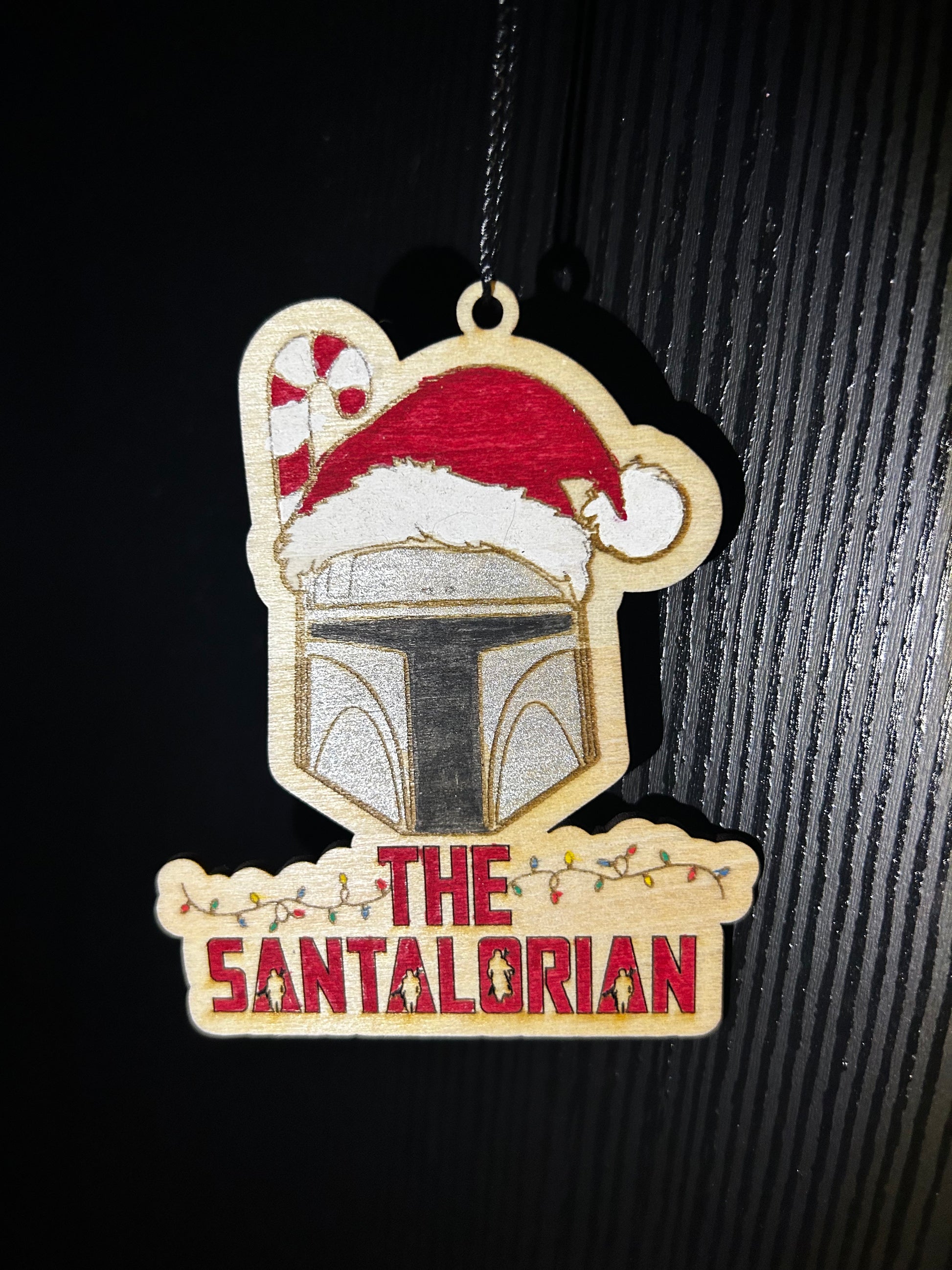 Expertly crafted, this Mandalorian Santalorian ornament is made from laser cut wood and hand painted for a truly unique design. Celebrate the holidays with this one-of-a-kind piece that is sure to add a touch of galactic charm to your tree. Made with precision and care, it's the perfect addition to any Star Wars fan's collection.