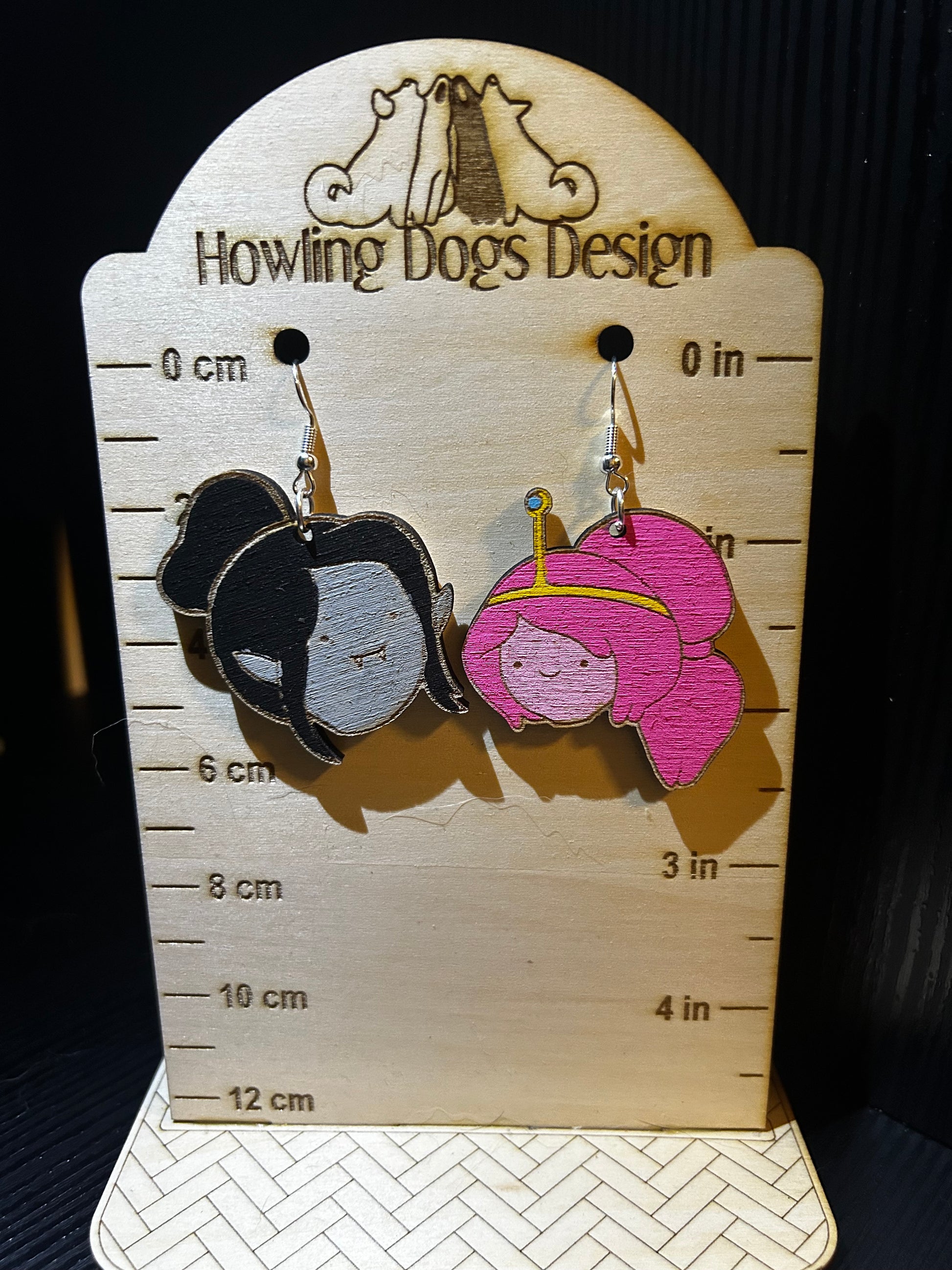 Represent your love for Adventure Time with these laser cut and hand painted Marceline and Princess Bubblegum earrings. These unique earrings showcase your favorite characters and are a must-have for any fan. Made with high quality materials, these earrings are a fun and stylish addition to your jewelry collection.