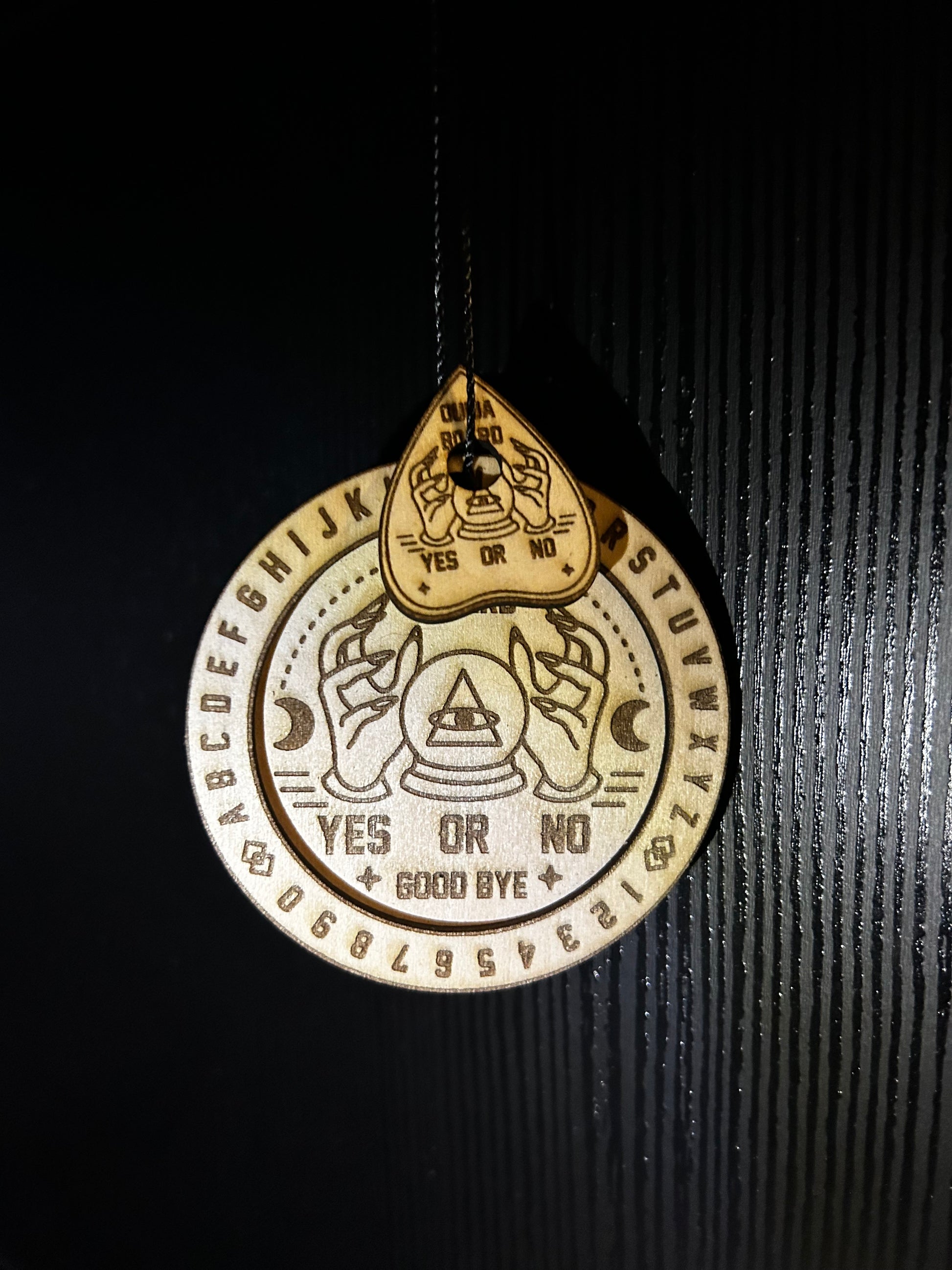This Ouija ornament is expertly crafted from laser cut wood, providing a unique and intricate design. The precision of the laser cutting technique ensures intricate details and a flawless finish. Enhance your holiday decor with this high-quality ornament.