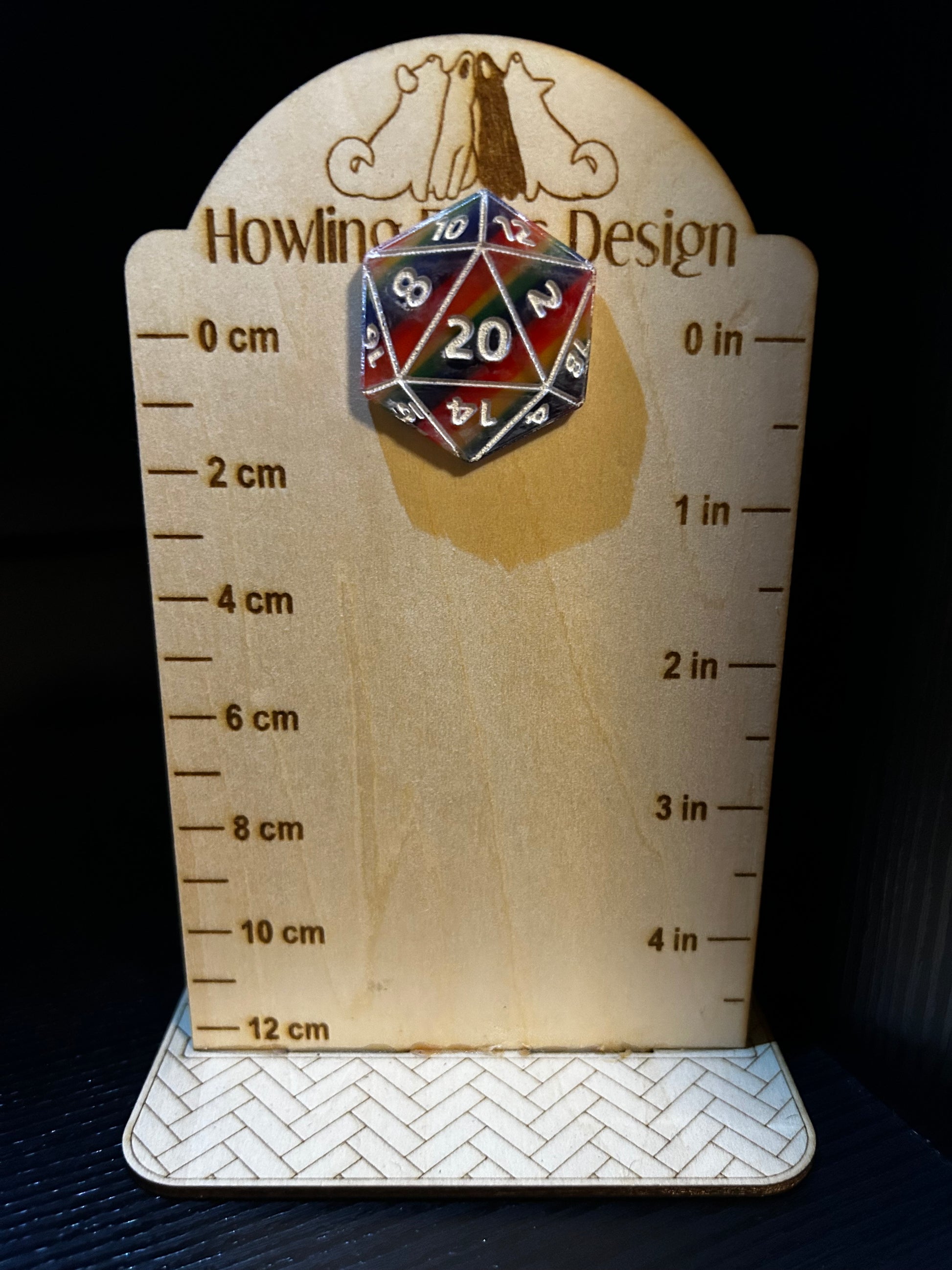 This Rainbow D20 Dice pin is a must-have for any tabletop RPG enthusiast. Made from laser cut acrylic, it boasts a vibrant rainbow design and a 20-sided dice shape. Bring a touch of whimsy and luck to your next game night with this unique pin.