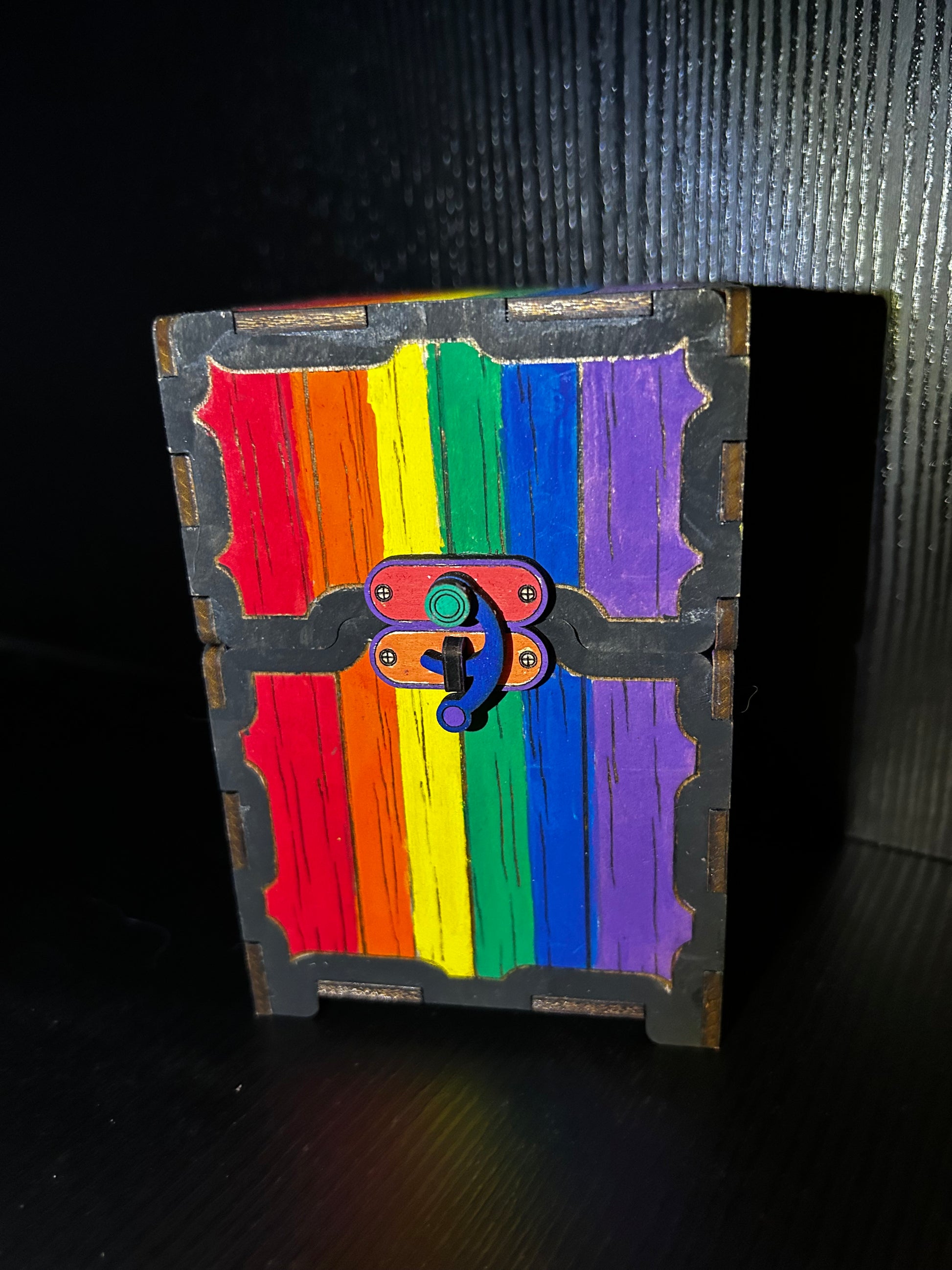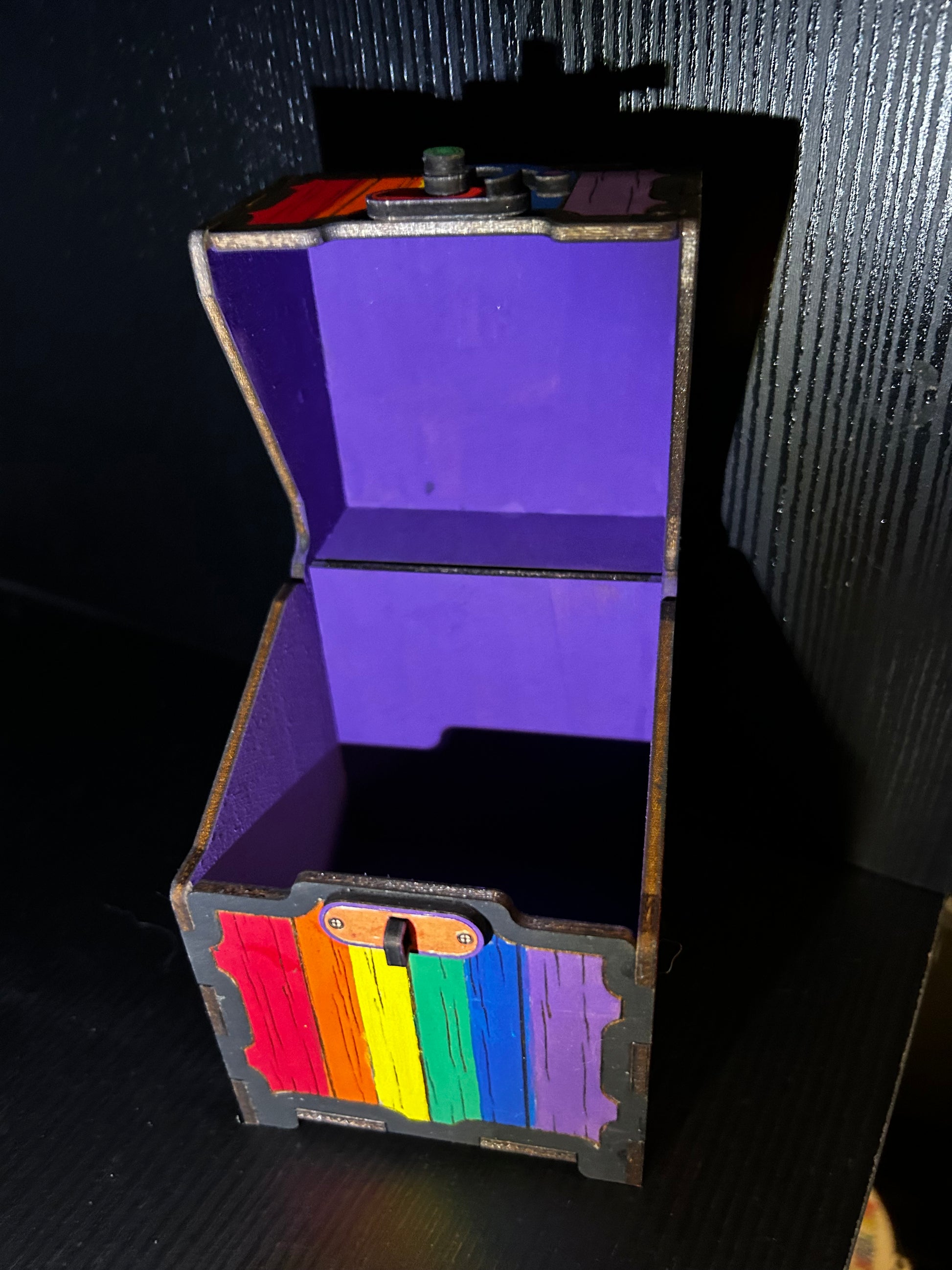 Crafted with precision, the Rainbow deck box features hand-painted laser-cut wood for a unique and vibrant design. Keep your cards safe and organized in style with this expertly crafted box. Protect your deck while showcasing your love for gaming.