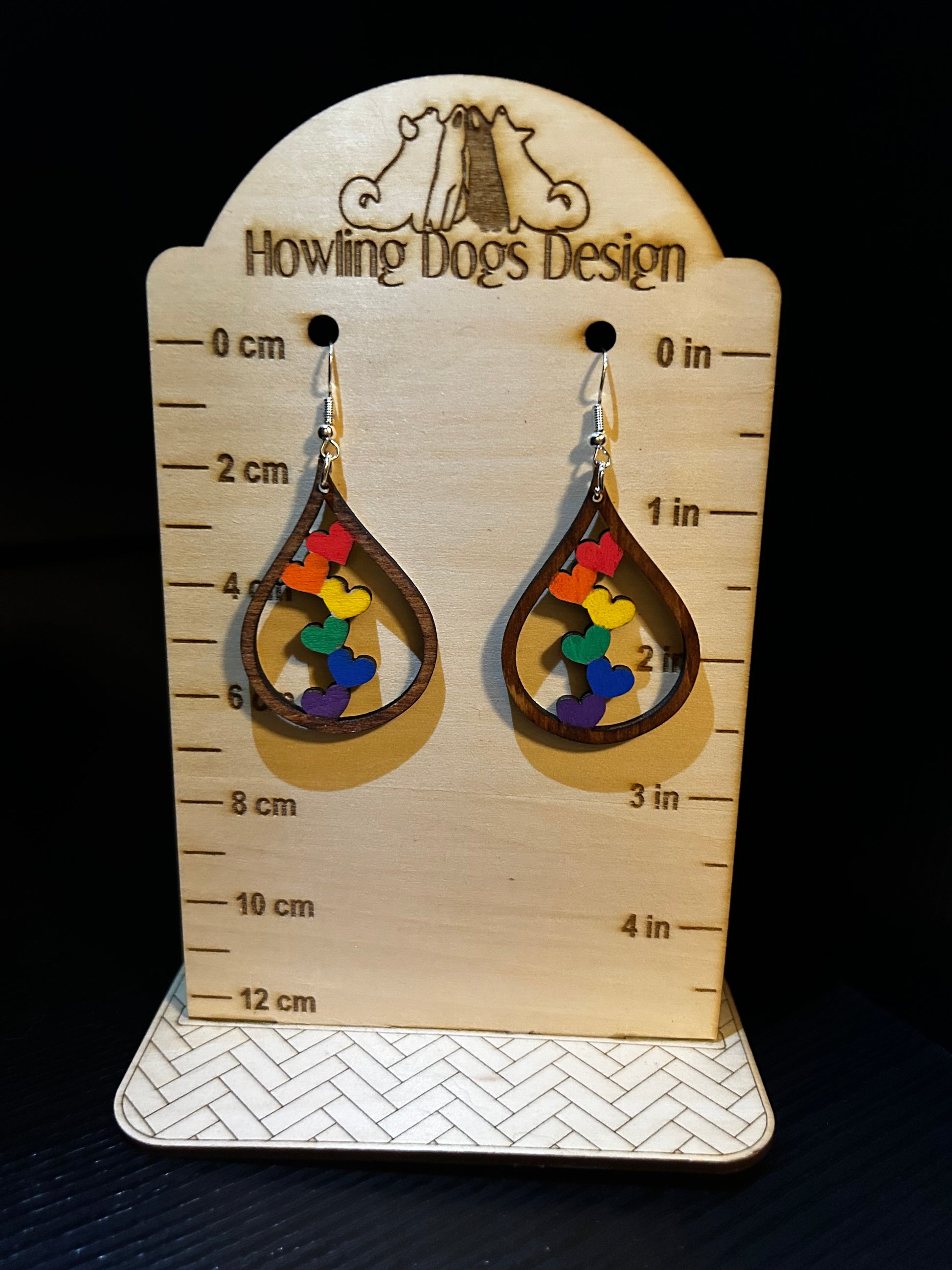 Add a touch of pride to your outfit with our rainbow heart earrings. These earrings are made of laser cut wood, hand painted with vibrant colors to show your support for the LGBTQ+ community. Take pride in your style with these unique and eye-catching earrings.