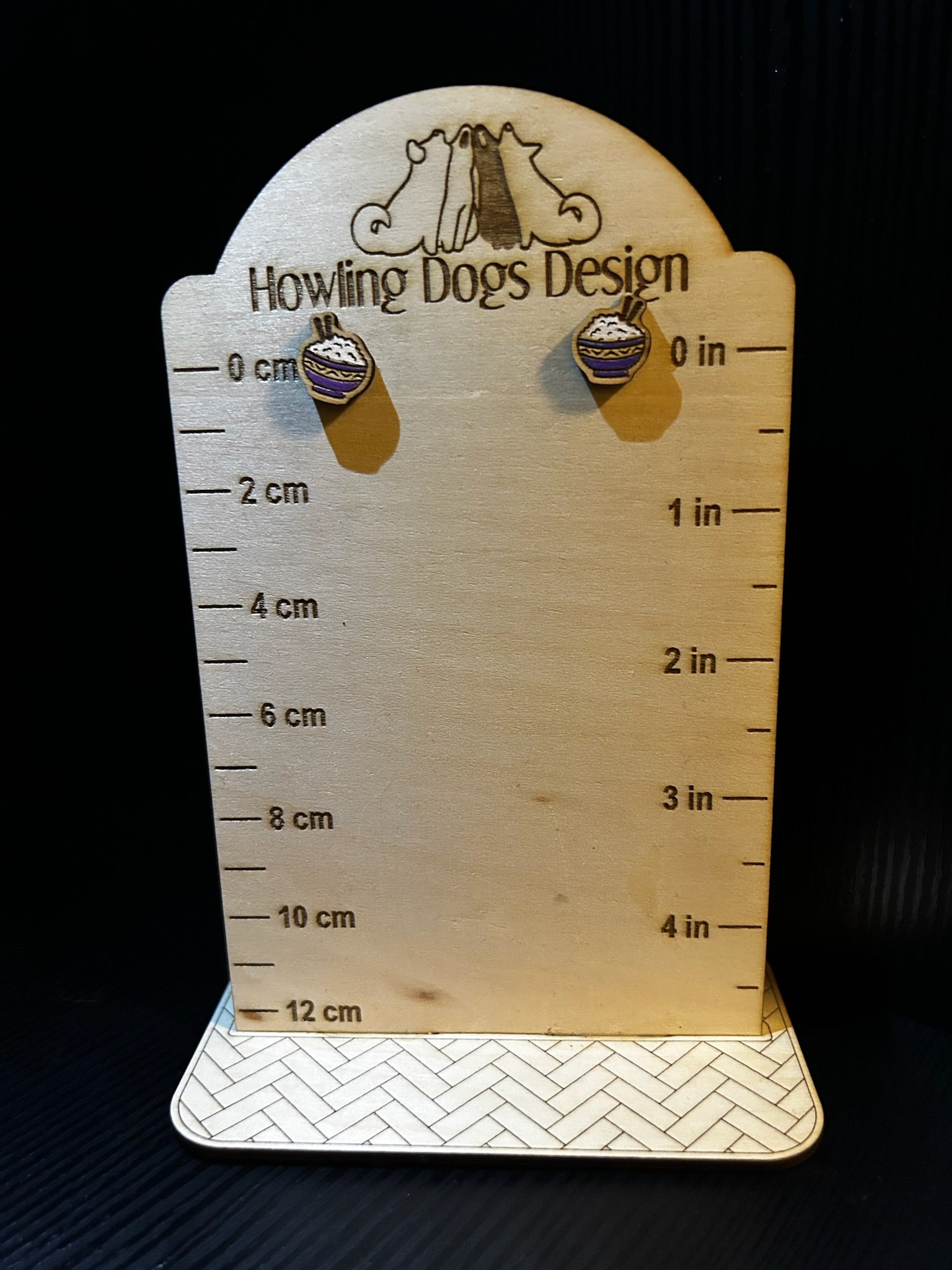 Expertly crafted and hand-painted, these laser cut wood earrings resemble delightful rice bowls. Add a touch of unique charm to your wardrobe and stand out with this one-of-a-kind accessory. Lightweight and versatile, these earrings are perfect for any occasion.