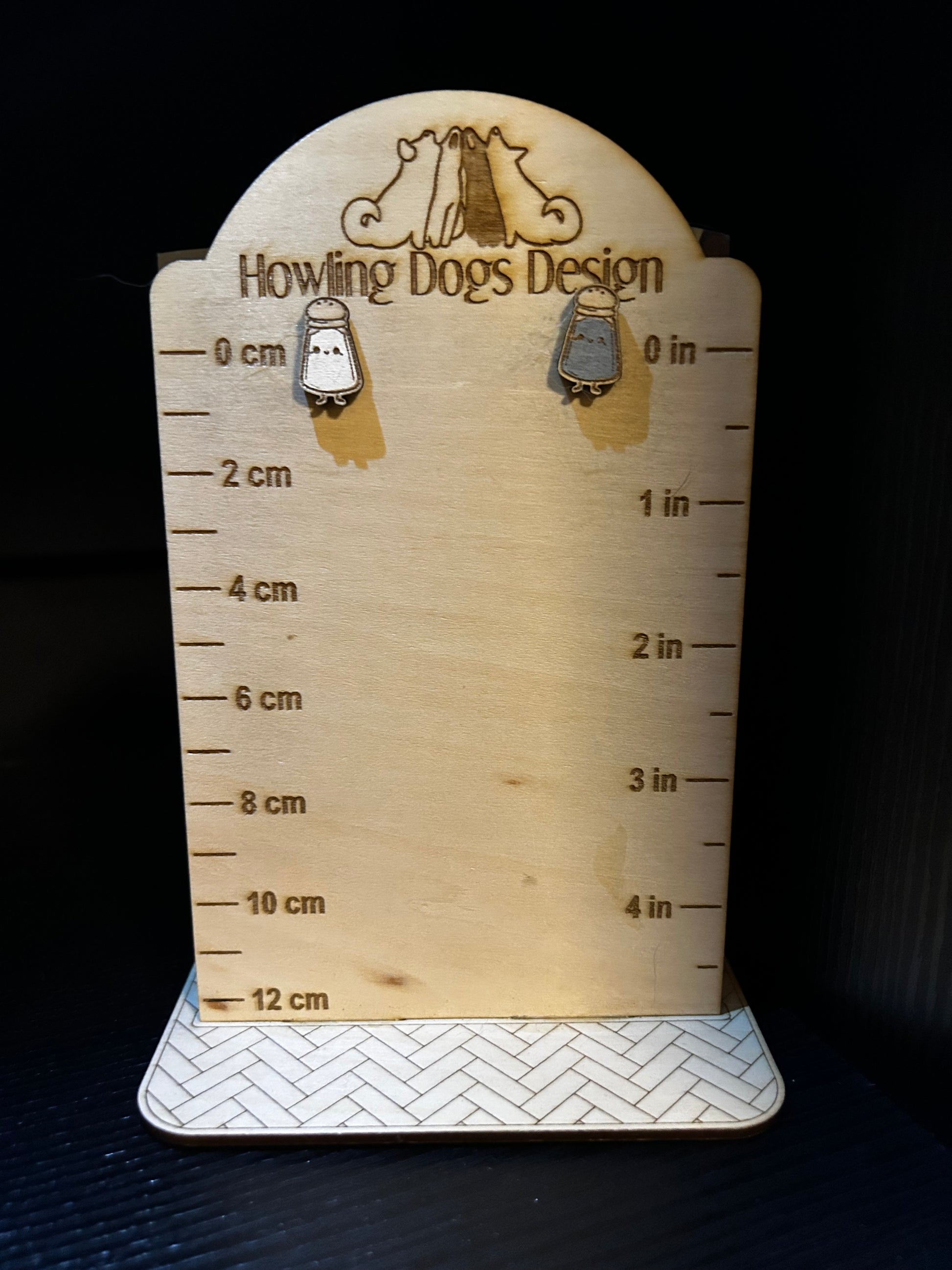 Add a unique touch to your jewelry collection with our handcrafted salt and pepper earrings. Laser cut from wood and hand painted, each pair is a one-of-a-kind work of art. Express your individuality with these stylish yet eco-friendly earrings.