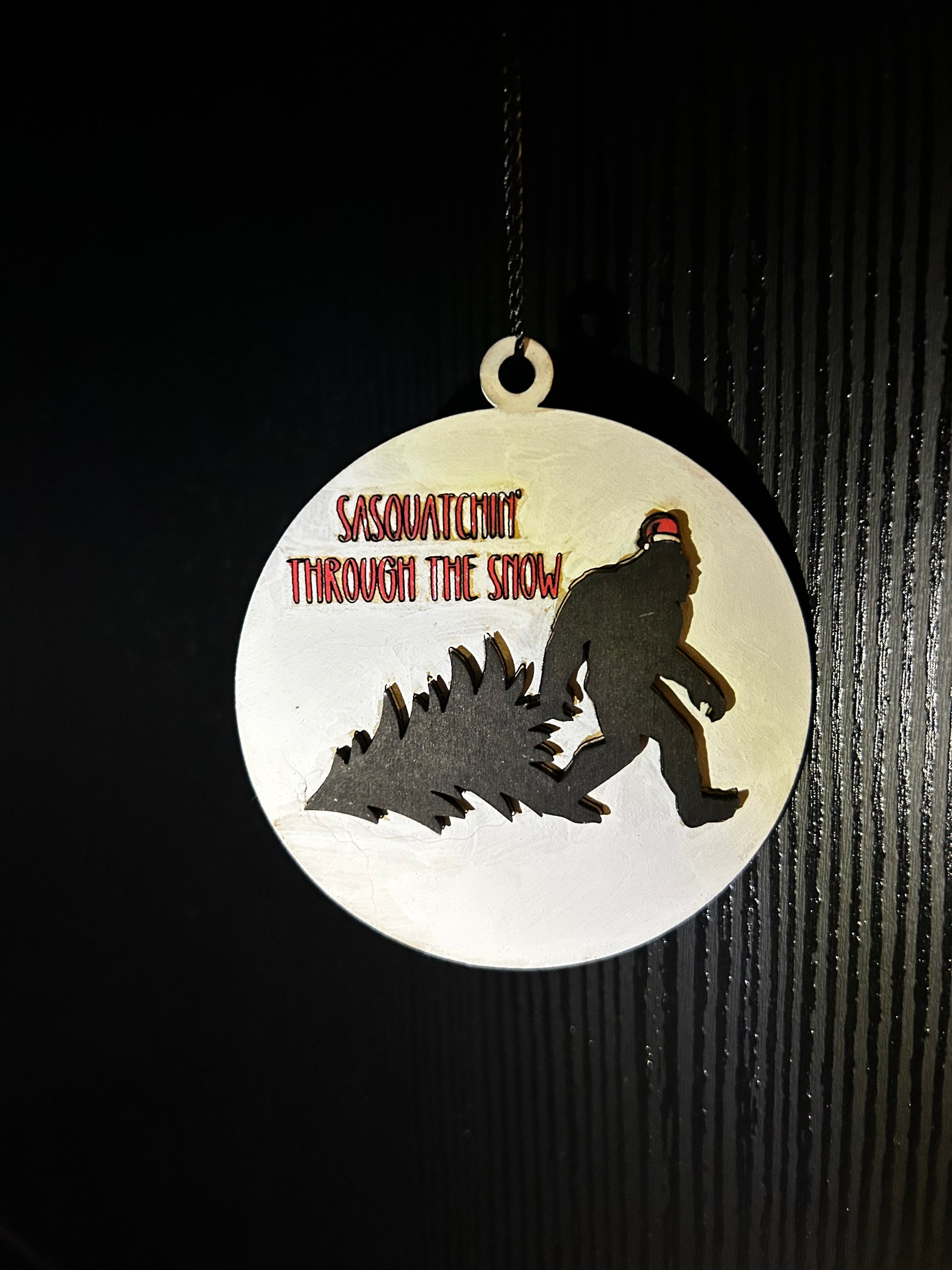 Expertly crafted and hand-painted, our Sasquatchin through the snow ornament will make a charming addition to any holiday decor. Made with laser-cut wood, this unique piece captures the spirit of the season and adds a touch of whimsy to your tree.
