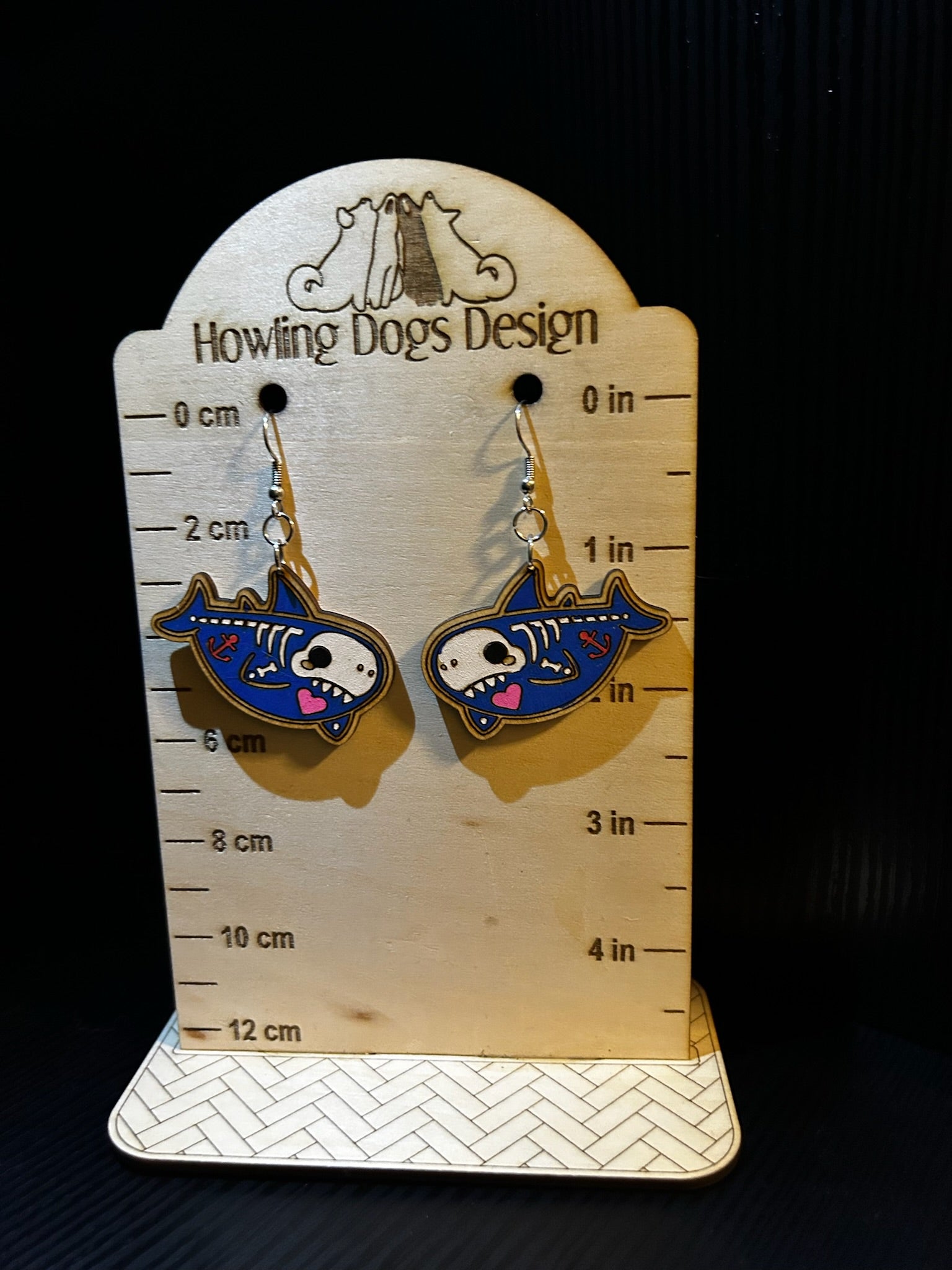 Crafted from laser cut wood and expertly hand painted, these Shark Skeleton earrings are a striking addition to any outfit. Show off your love for the ocean's apex predator with these unique and detailed earrings. Truly a must-have for any shark enthusiast.