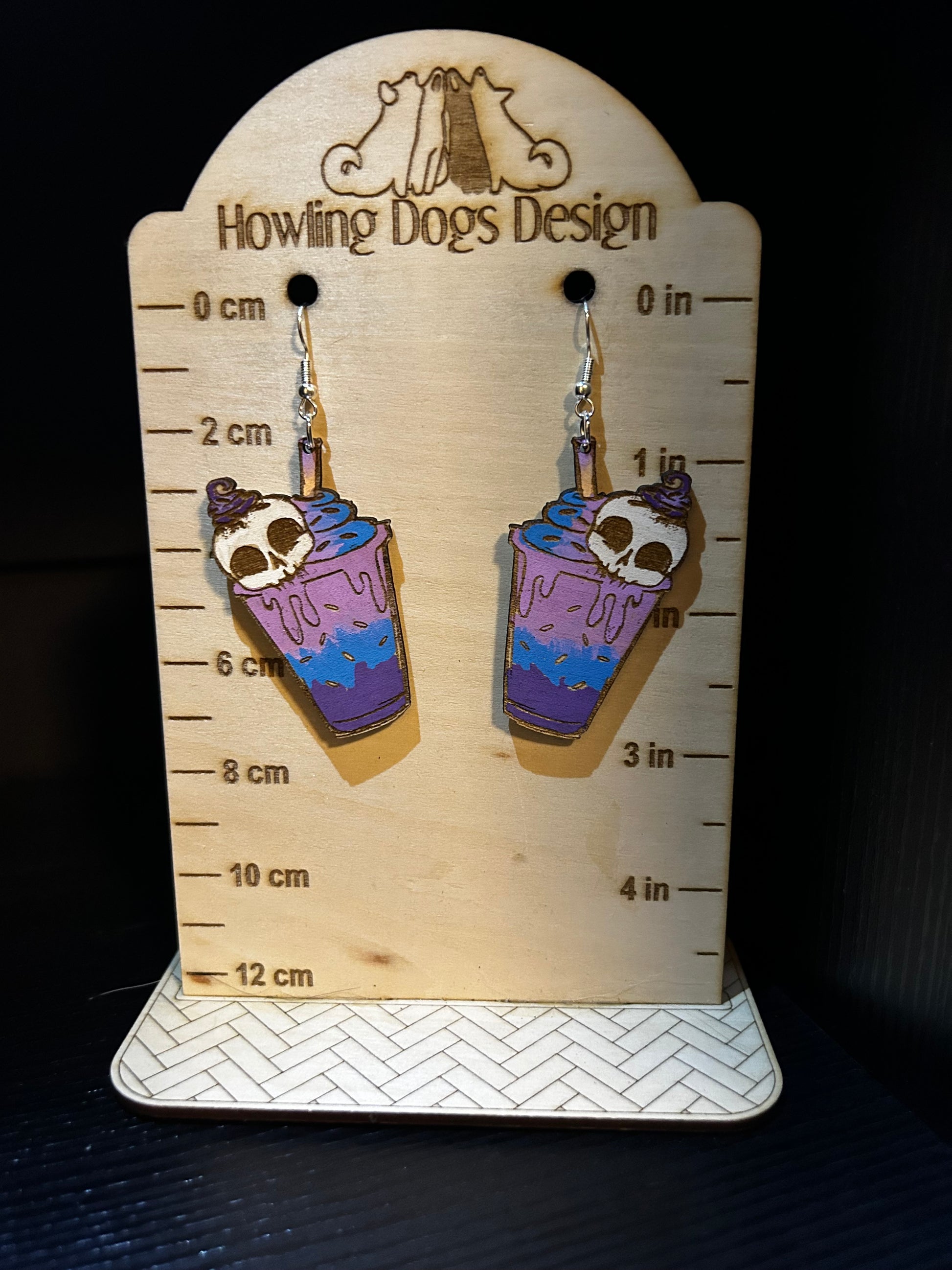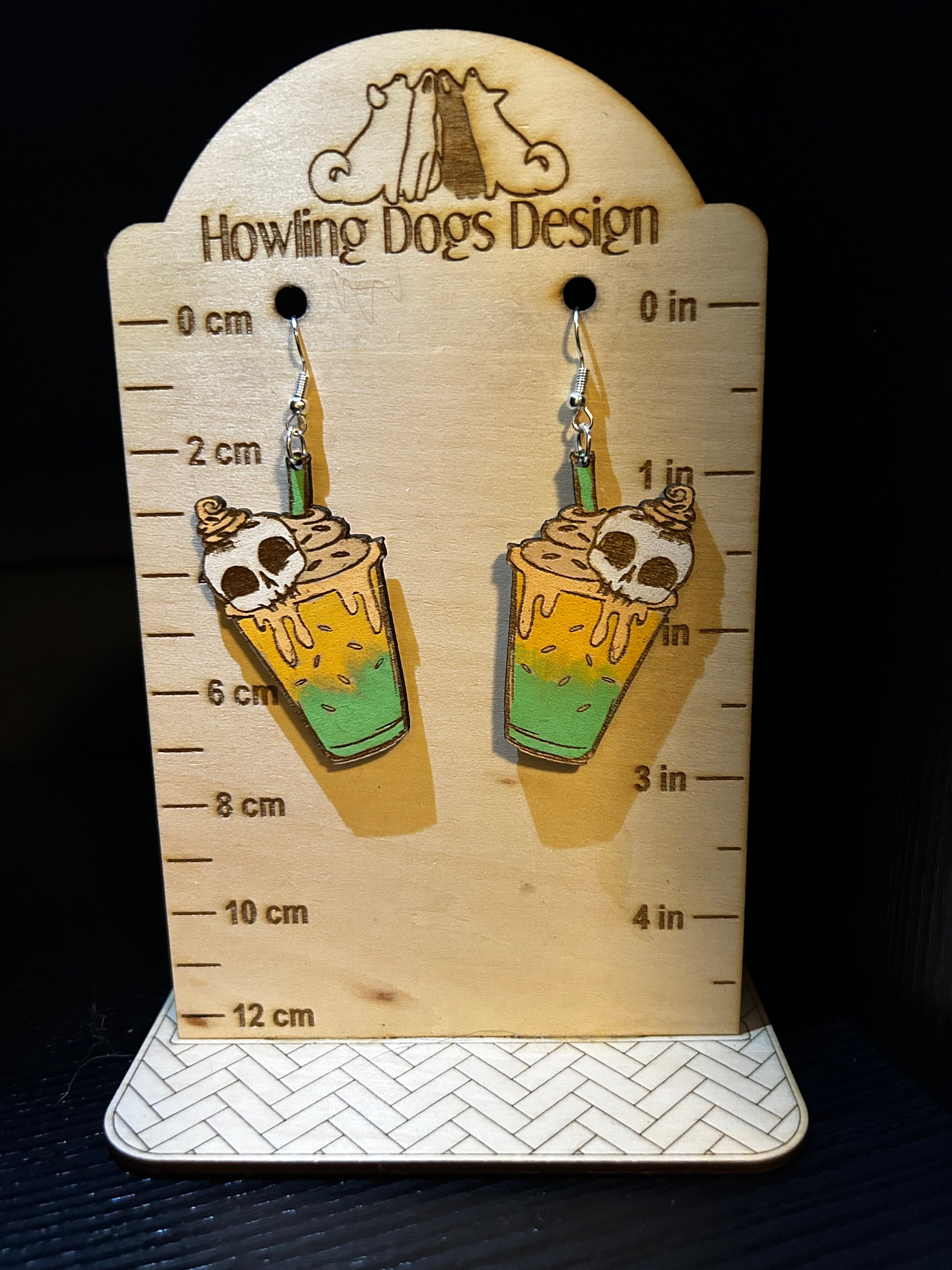 Introducing the Skull Frappe Drink - the perfect accessory for any caffeine lover! These laser cut wood earrings feature a fun and unique design that will add a touch of quirkiness to any outfit. With their lightweight feel and intricate details, they are sure to make a statement wherever you go. Own a piece of wearable art today.