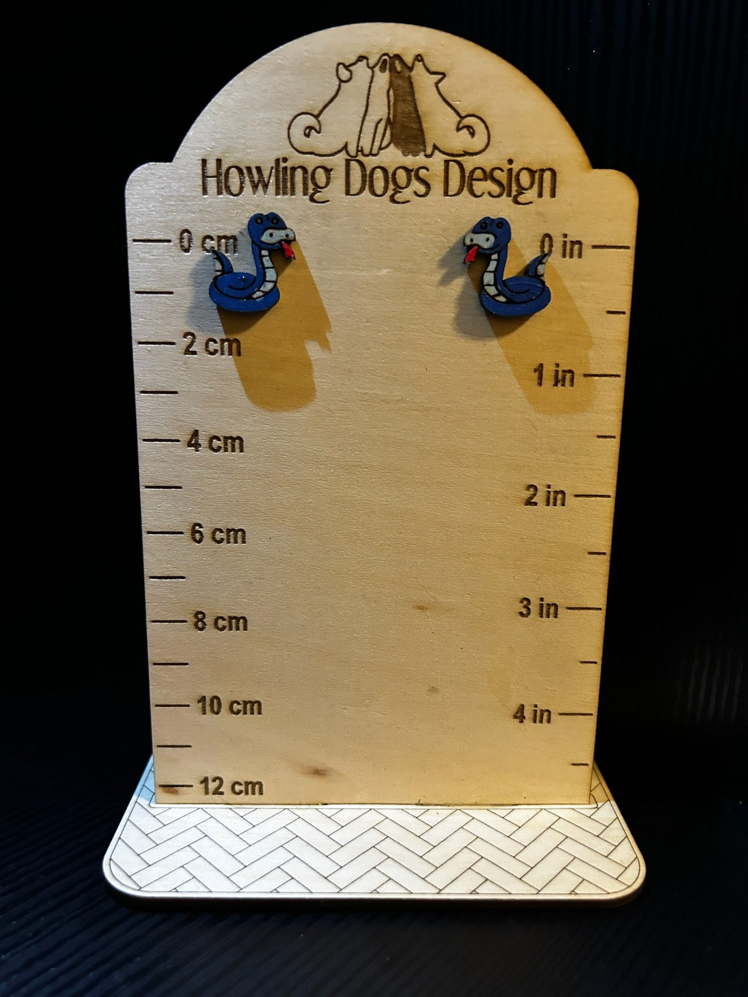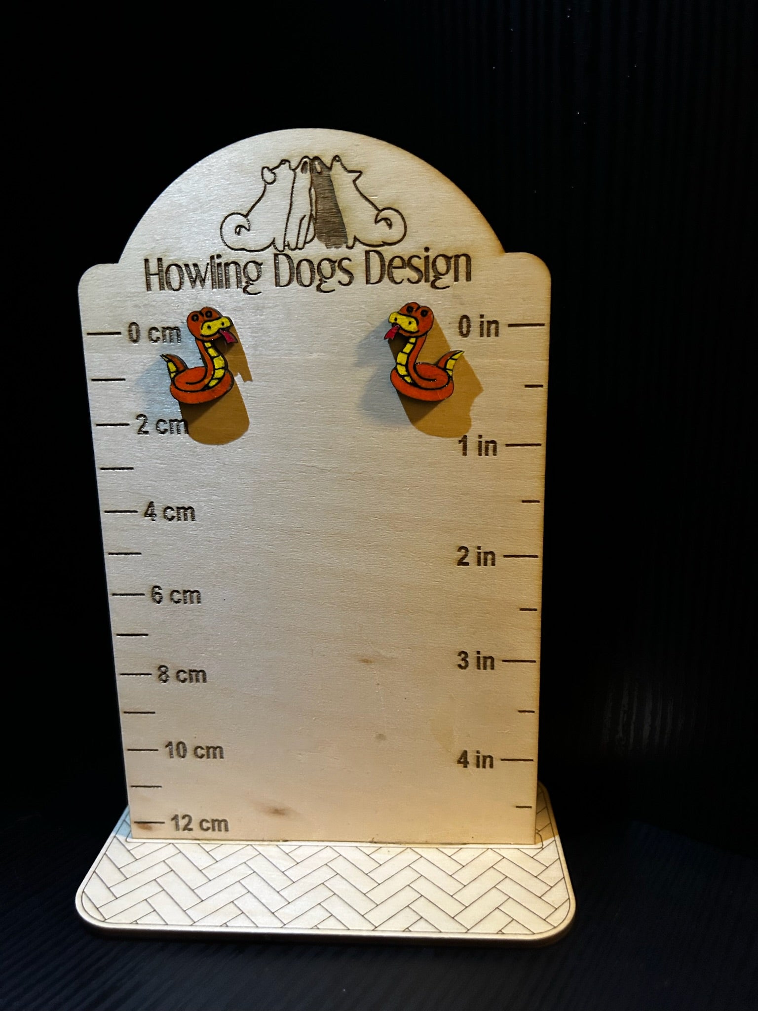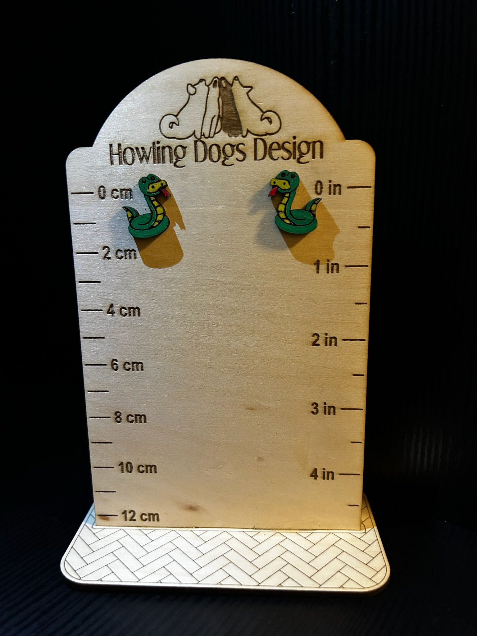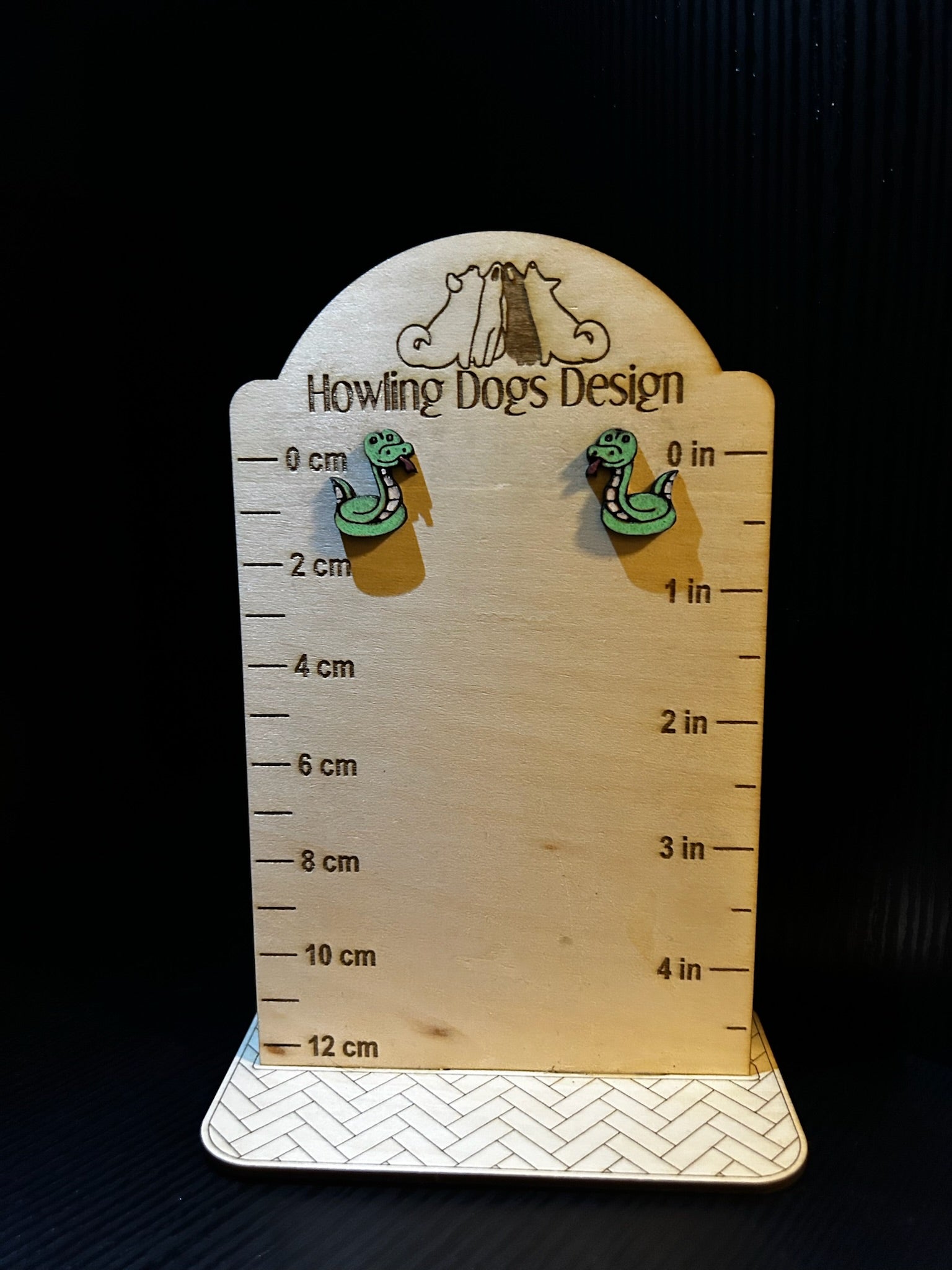 Hand painted and laser cut on high quality wood, these snake earrings are the perfect accessory to add a touch of nature-inspired style to any outfit. Bring a unique and eye-catching element to your look with these expertly crafted earrings.