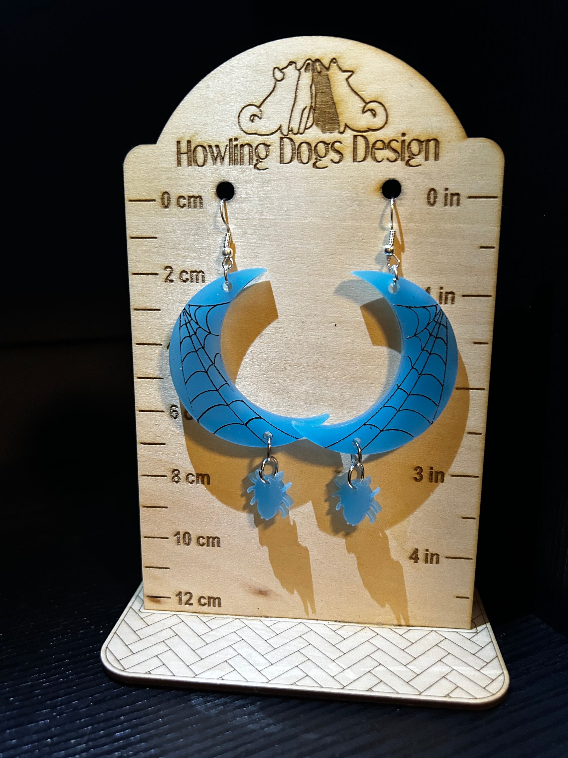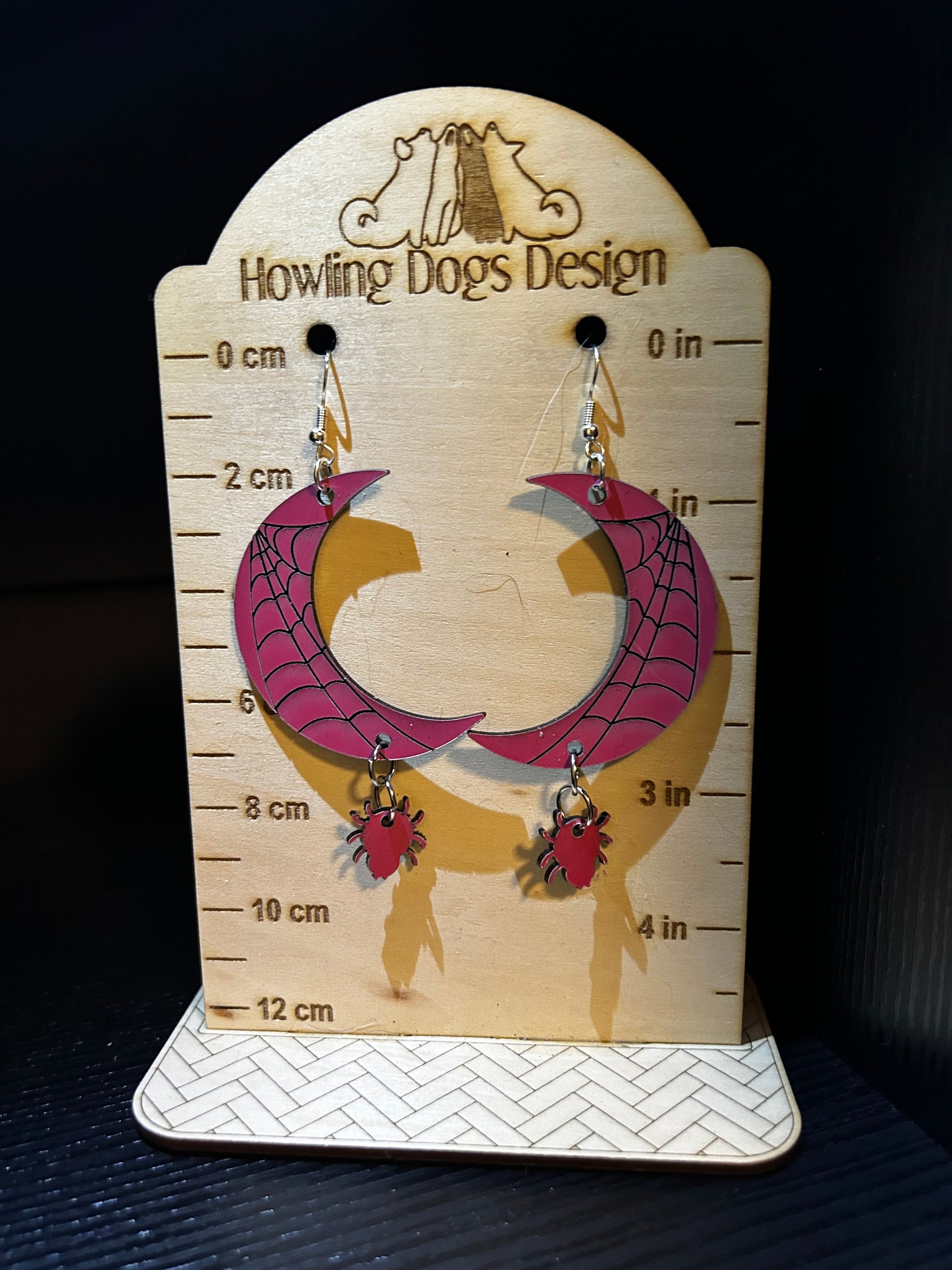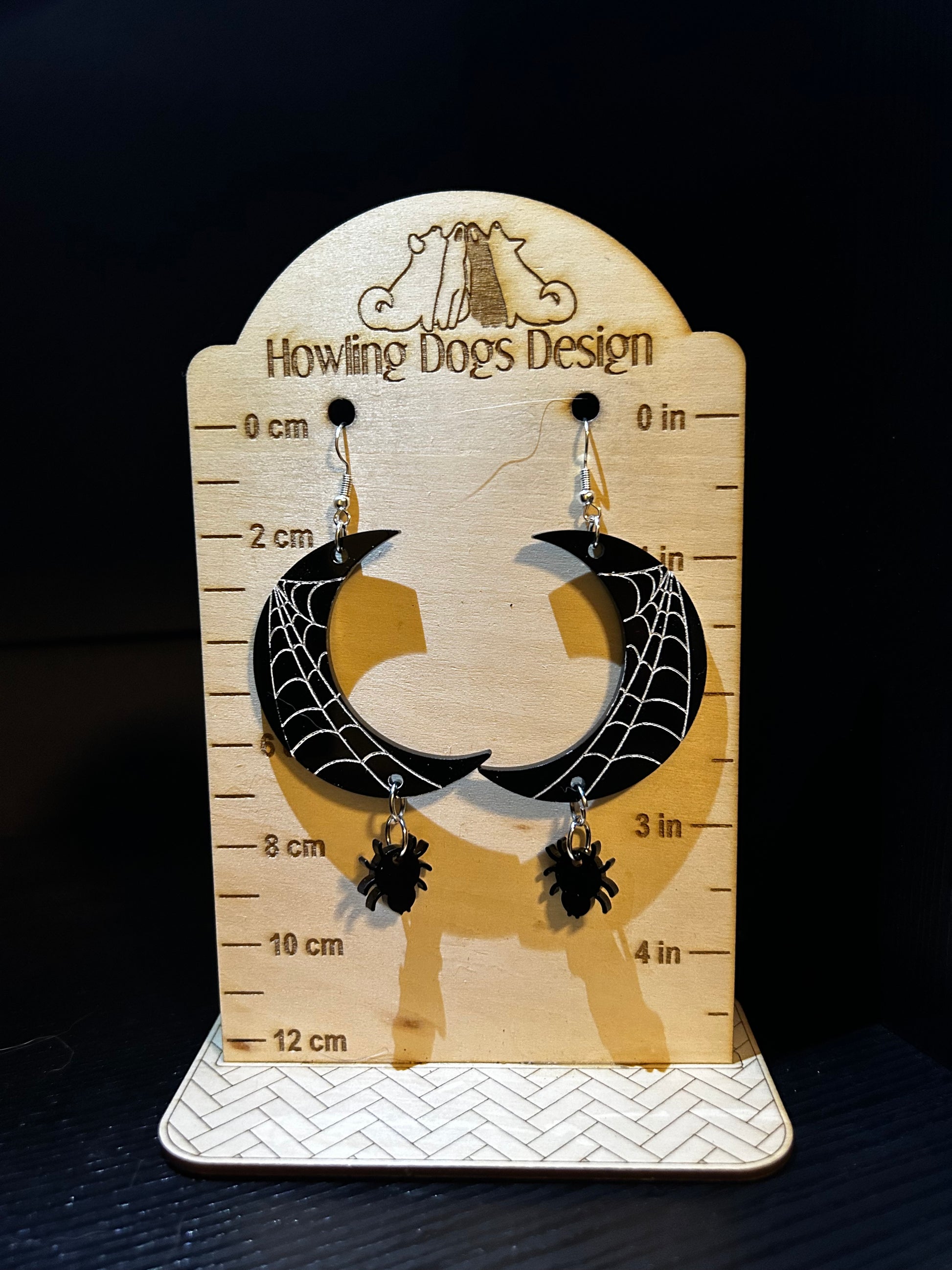 Expertly crafted from laser cut acrylic, these Spiderweb Moon earrings showcase a unique and intricate design of a spiderweb woven around a stunning moon. Add a touch of mystery and elegance to your look with these statement earrings.