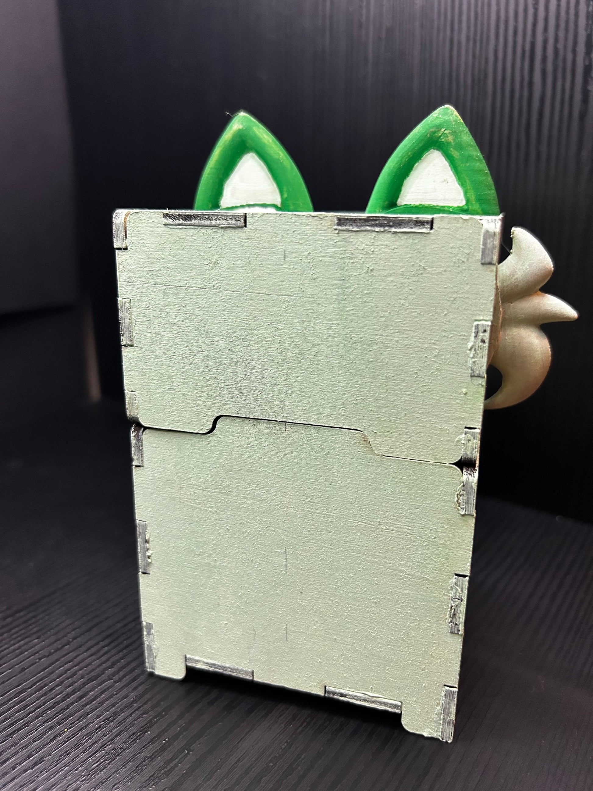 Expertly crafted with laser cut wood, the Sprigatito Deck Box boasts 3D printed and hand painted accents for a unique and intricate design. Organize and protect your cards with style and precision. Elevate your game with this one-of-a-kind deck box.