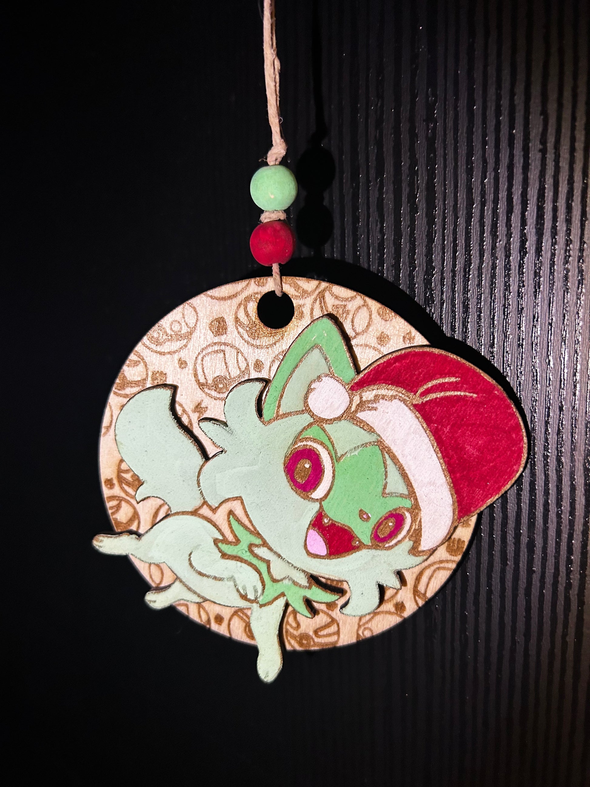 This Sprigatito ornament is expertly crafted with laser cut wood and hand painted with intricate details. Perfect for any Pokemon fan, this ornament is a unique addition to any holiday decor. Made with precision and care, this ornament captures the essence of the beloved Pokemon characters with its realistic design.