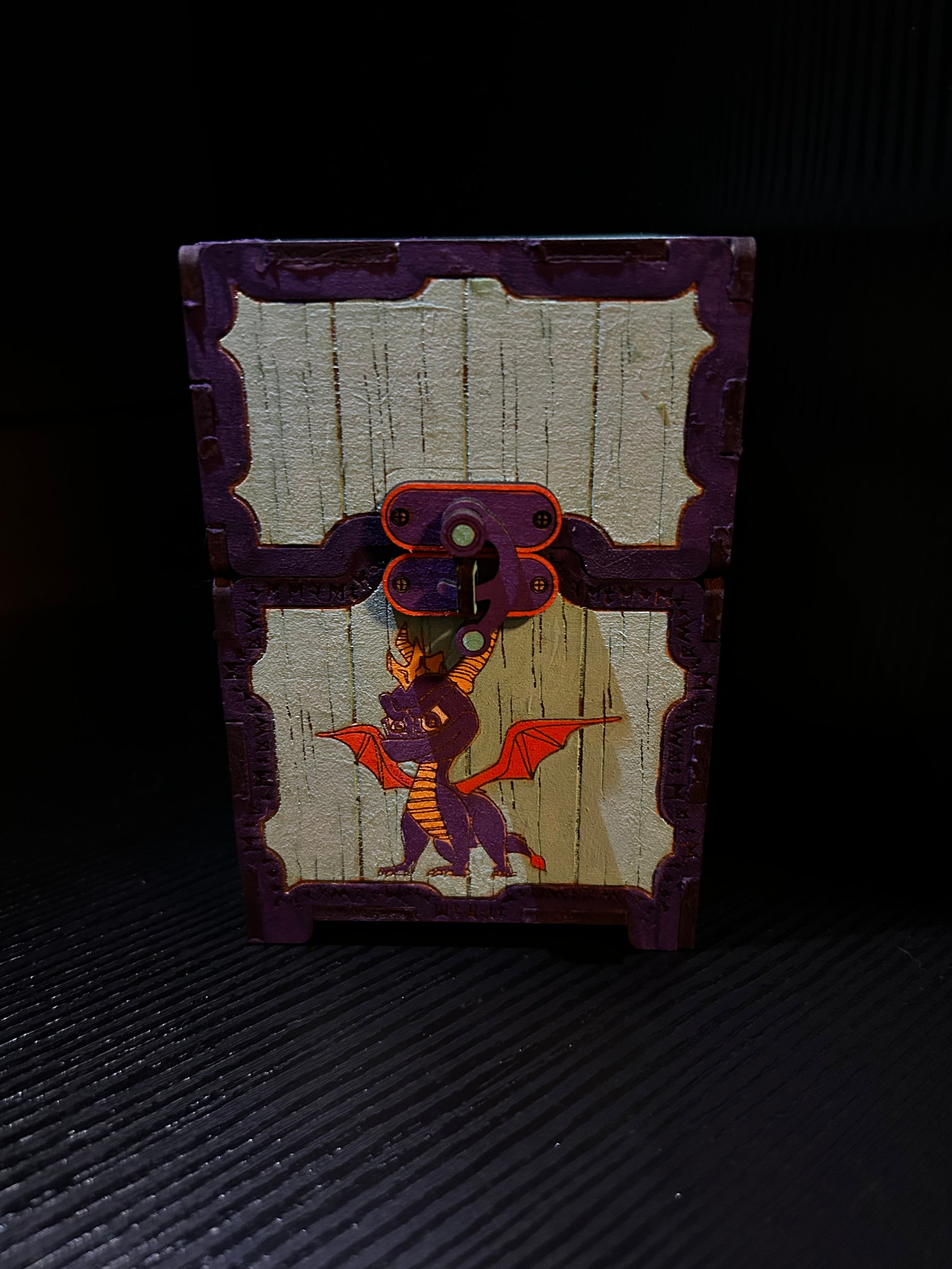 Store your collectible trading cards in style with the Spyro Deck Box. Made from laser cut wood and hand painted with intricate details, this card box not only protects your cards but also adds a decorative touch to your collection. A must-have for any trading card enthusiast.