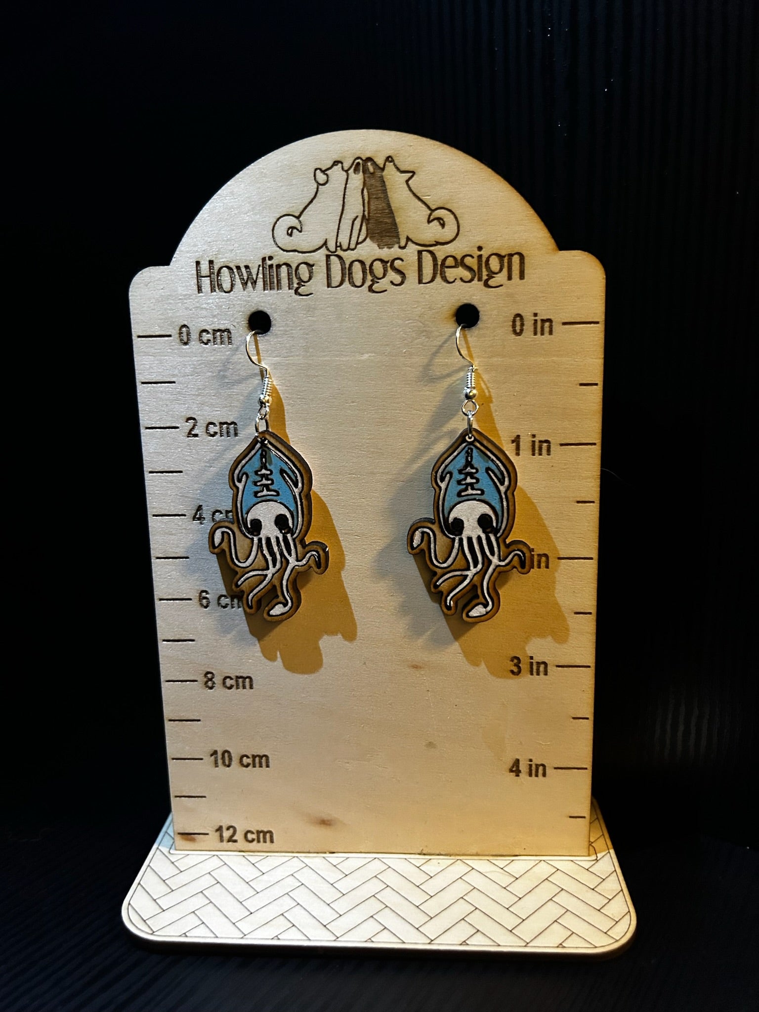 Expertly crafted from laser cut wood, these Squid Skeleton Earrings are a unique accessory for any sea lover. Hand painted to perfection, they are a beautiful representation of the intricate details of a squid's skeleton. Add a touch of marine life to any outfit with these stunning earrings.