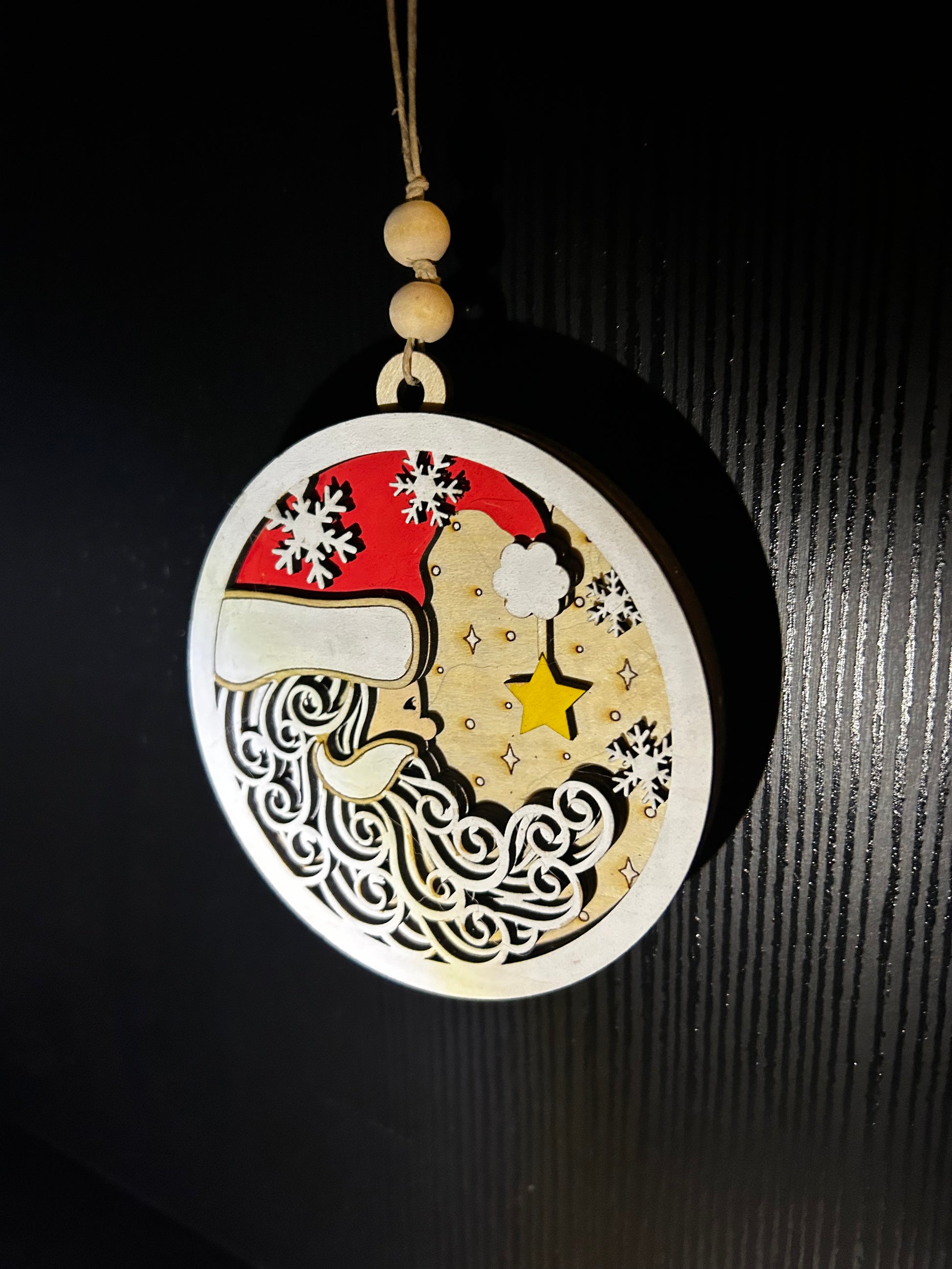 Expertly crafted with laser cut wood, this Swirly Santa ornament boasts intricate details and a hand-painted finish. Add a touch of festive charm to your holiday decor with this unique and beautifully designed ornament. Perfect for both the young and young-at-heart.