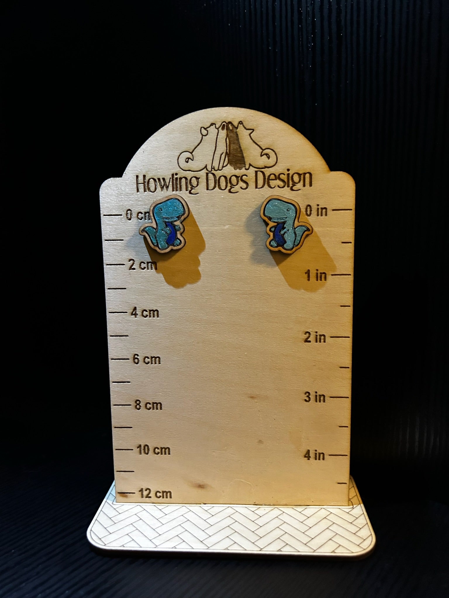 Add a unique touch to your style with these T-Rex Dinosaur earrings. Made of laser cut wood and hand painted, these blue earrings are perfect for any dinosaur lover. Made with precision, these earrings are a stunning addition to any outfit.