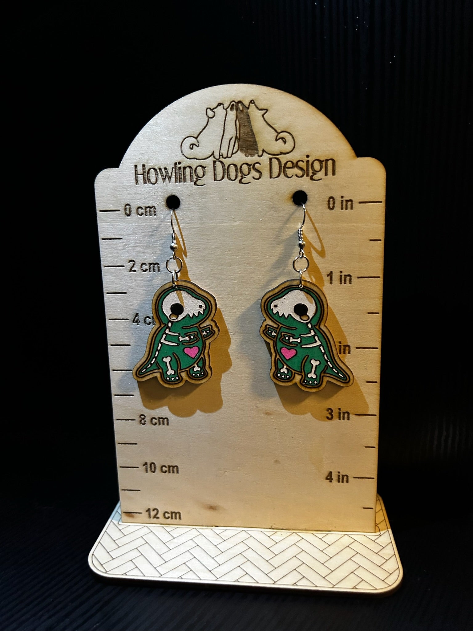 Crafted with laser-cut wood and hand-painted, these T-Rex skeleton earrings are a must-have for any dinosaur enthusiast. Lightweight and eye-catching, these earrings are sure to make a statement while adding a unique touch to any outfit. Perfect for fossil lovers and statement jewelry collectors.