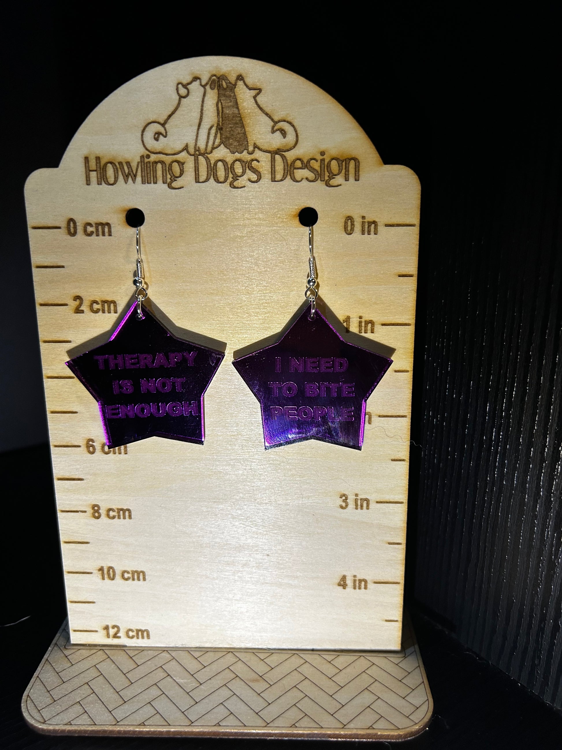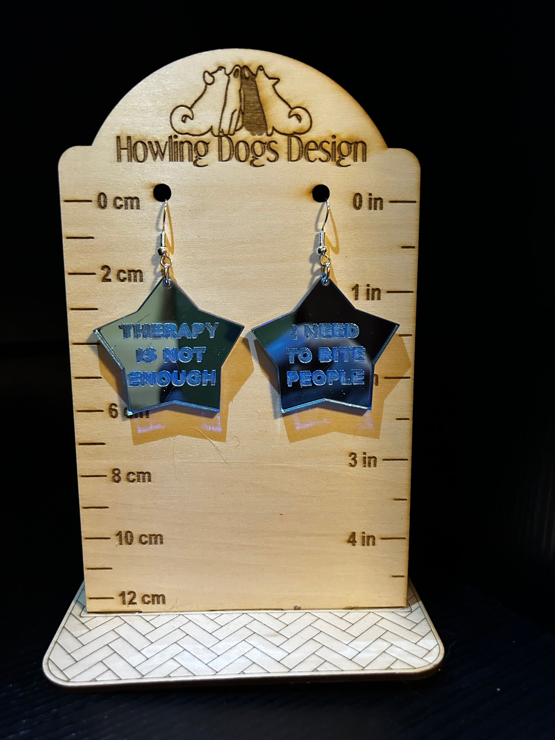 These laser cut acrylic star shape earrings are more than just a fashion statement. With the message "Therapy is Not Enough I need to bite people" engraved, they serve as a reminder that mental health care goes beyond just therapy. A unique accessory for those who understand the importance of holistic healing.