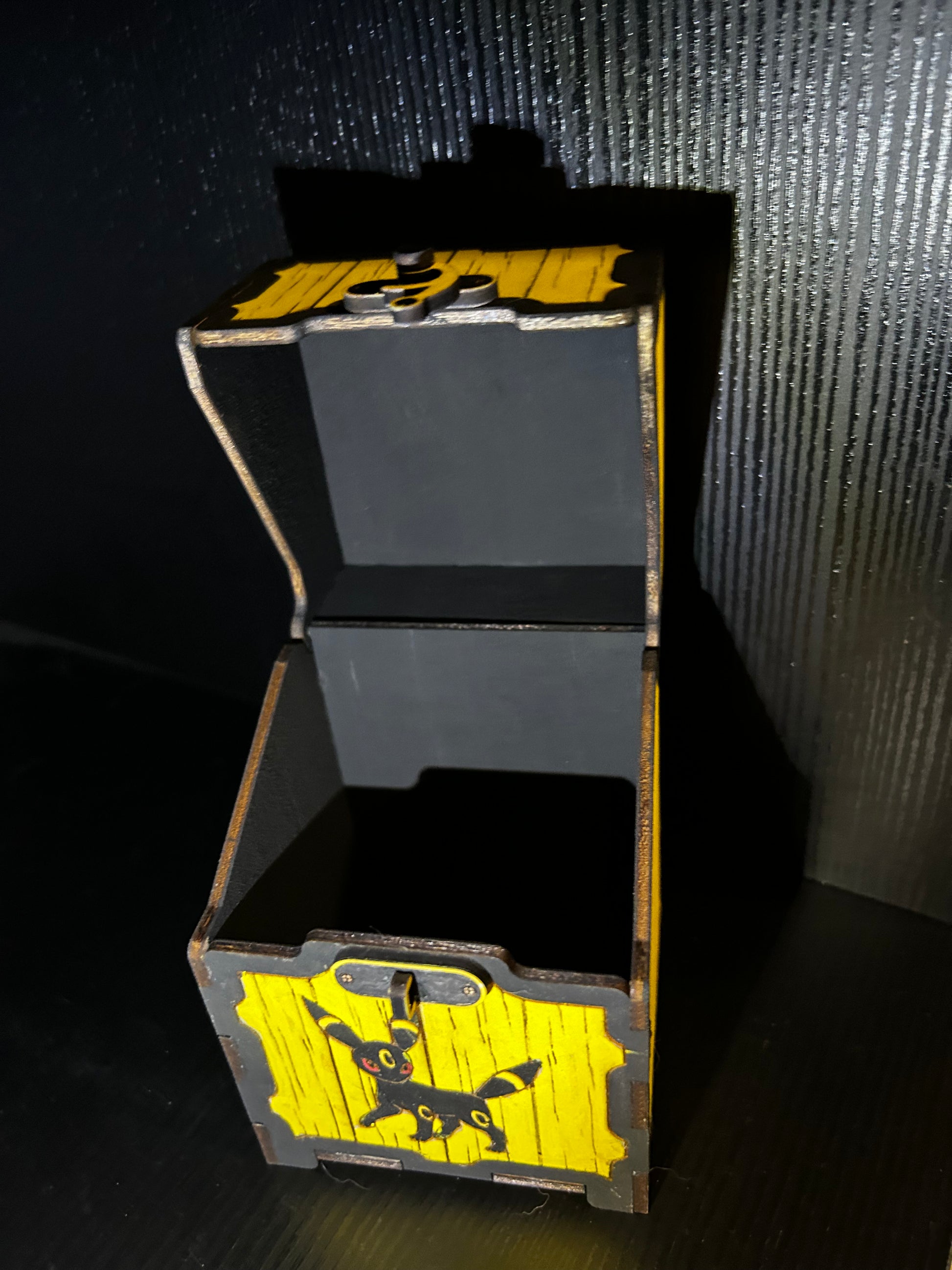 Expertly crafted with laser cut wood and painted by hand, the Umbreon Deck Box combines practicality and artistry. Protect and store your playing cards while showcasing your love for Pokémon with this unique deck box. Made with precision and care, this deck box is a must-have for any collector or player.