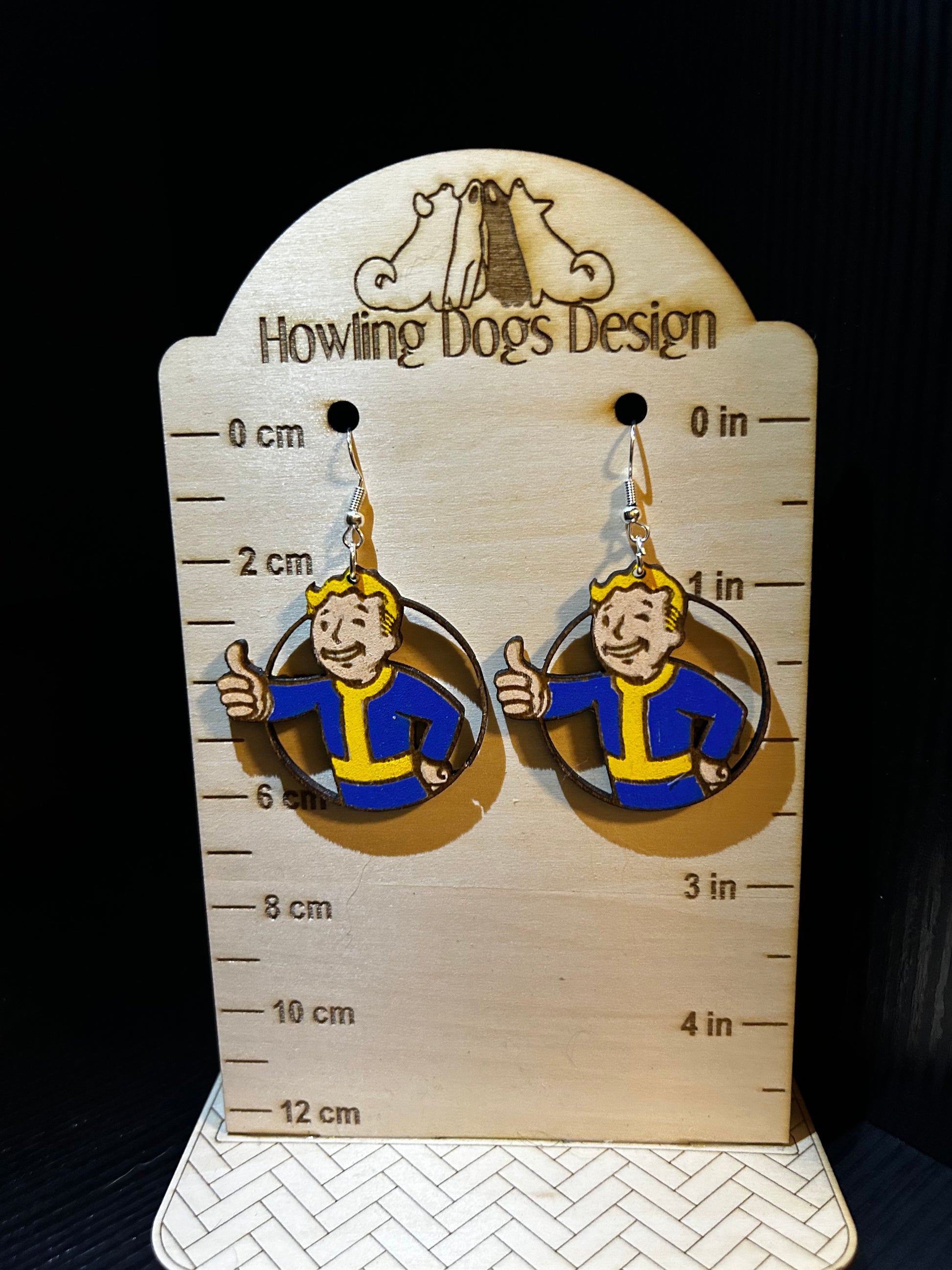 These Vault Boy Earrings are handcrafted from laser cut wood and hand painted with care. Expertly designed with fan-favorite Fallout character, these earrings are the perfect accessory for gamers and fans alike. Each pair is unique, adding a touch of personality to any outfit.
