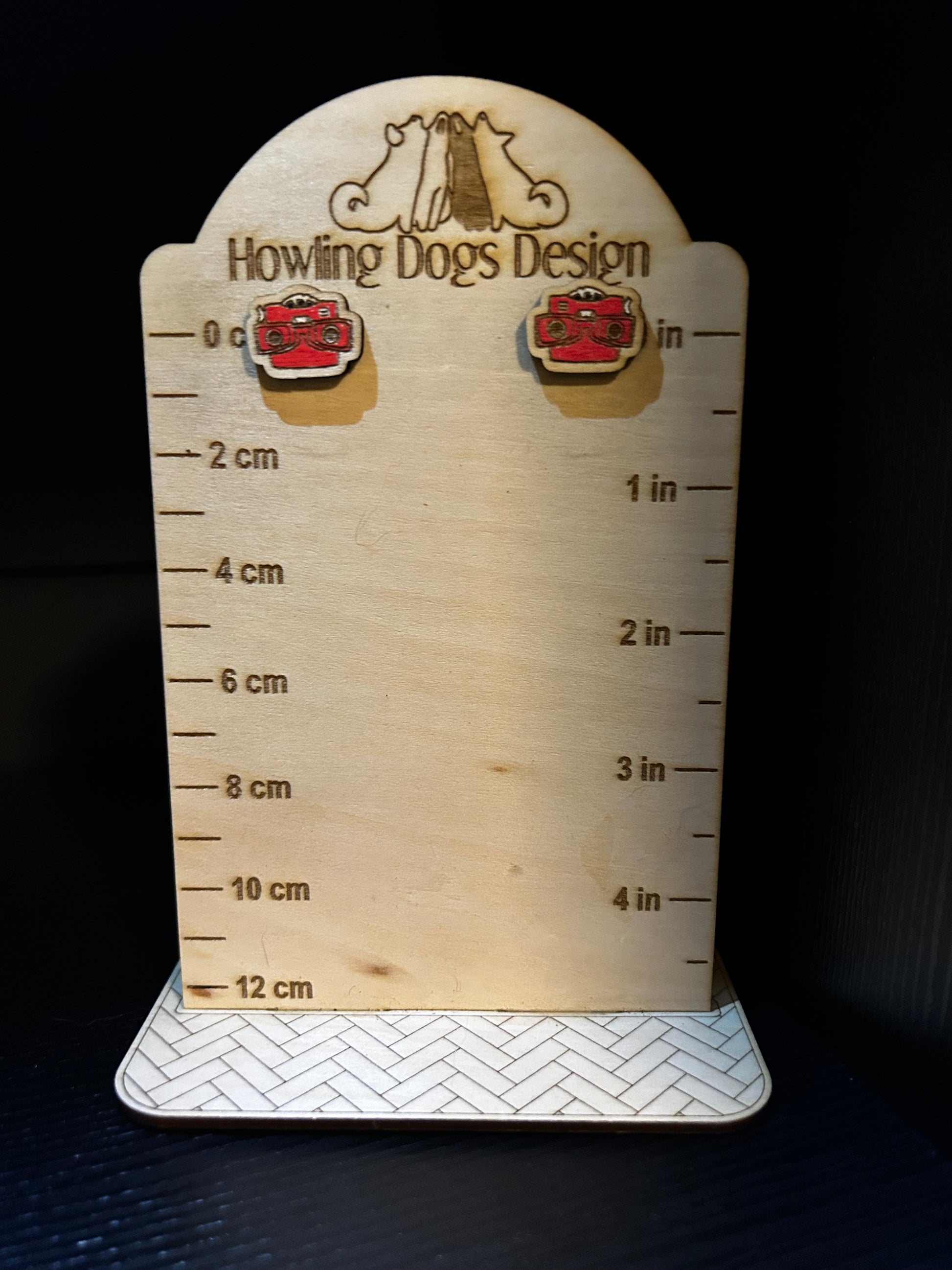 Expertly crafted and hand painted, these View master earrings showcase a unique laser cut wood design. With intricate details and bold colors, these earrings are the perfect addition to any outfit. Stand out from the crowd with these one-of-a-kind statement pieces.